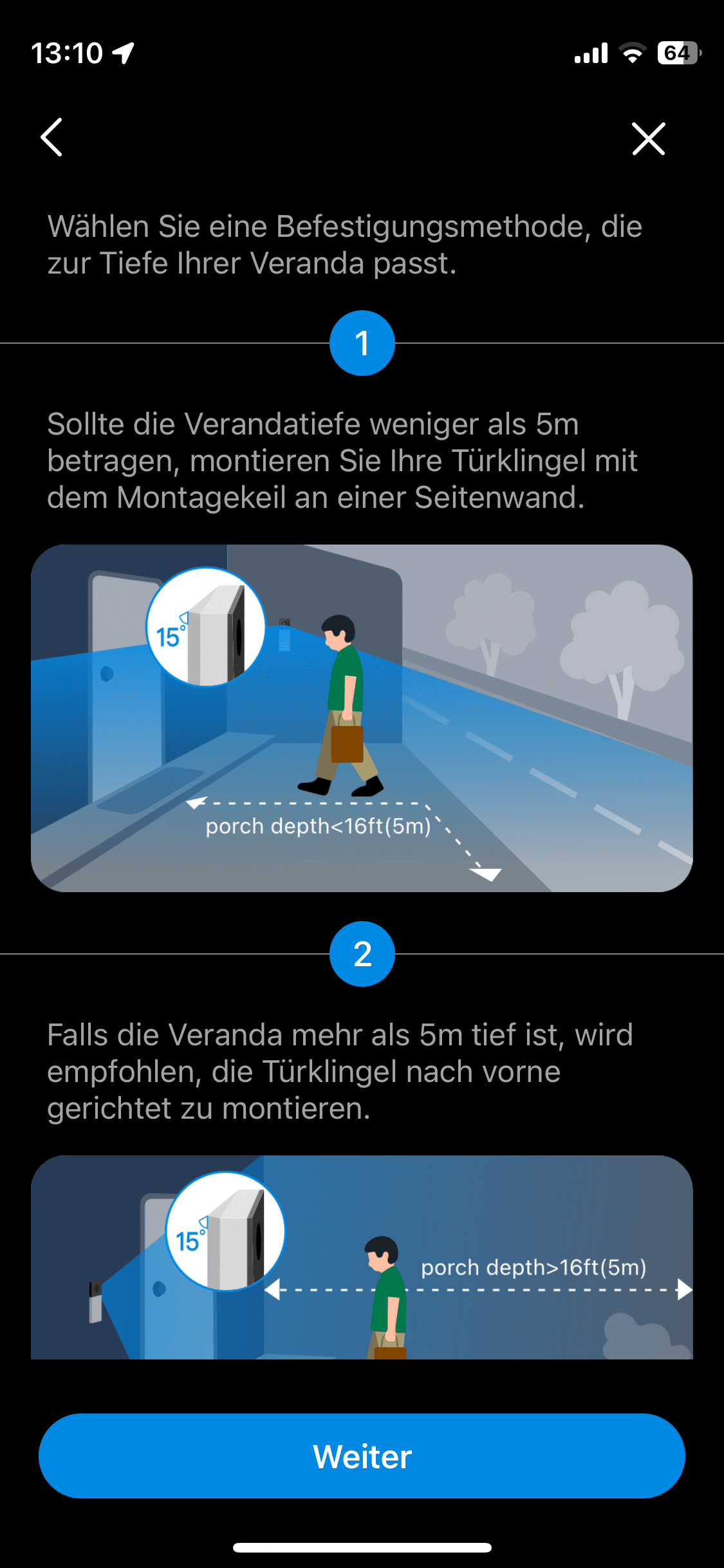 Mit einem Blickwinkel von beeindruckenden 180° behältst du einen großen Bereich vor deiner Haustür im Blick. Das vertikale Sichtfeld von 140° sorgt dafür, dass du selbst deine Fußmatte beobachten kannst. Praktisch ist das für all diejenigen, die gerne ihre georderten Pakete auf der Fußmatte abstellen lassen. Auf das Sichtfeld kannst du mithilfe der dem Lieferumfang beiliegenden Unterlegkeilen Einfluss nehmen. So lässt sich die Klingel 5° nach unten oder 15° nach links oder rechts neigen.
