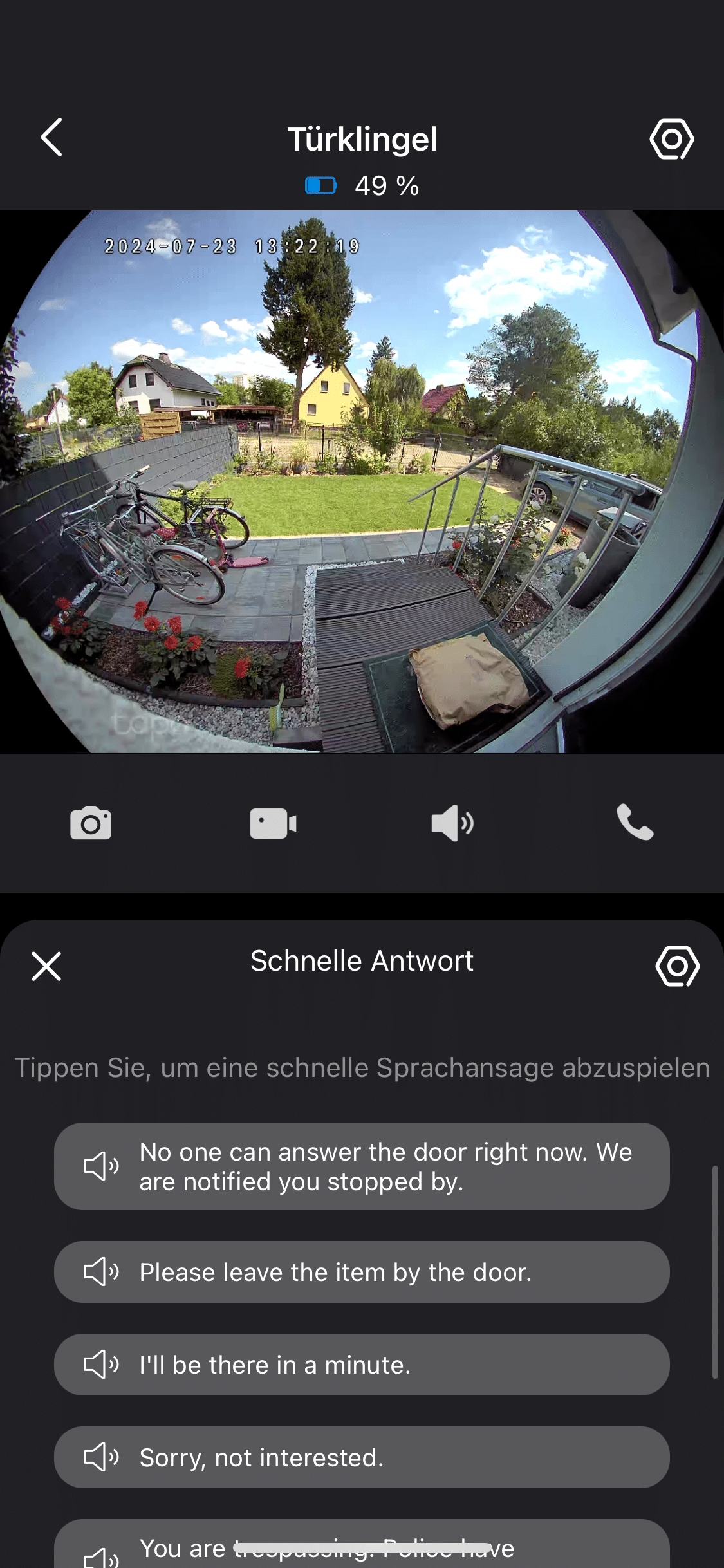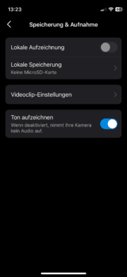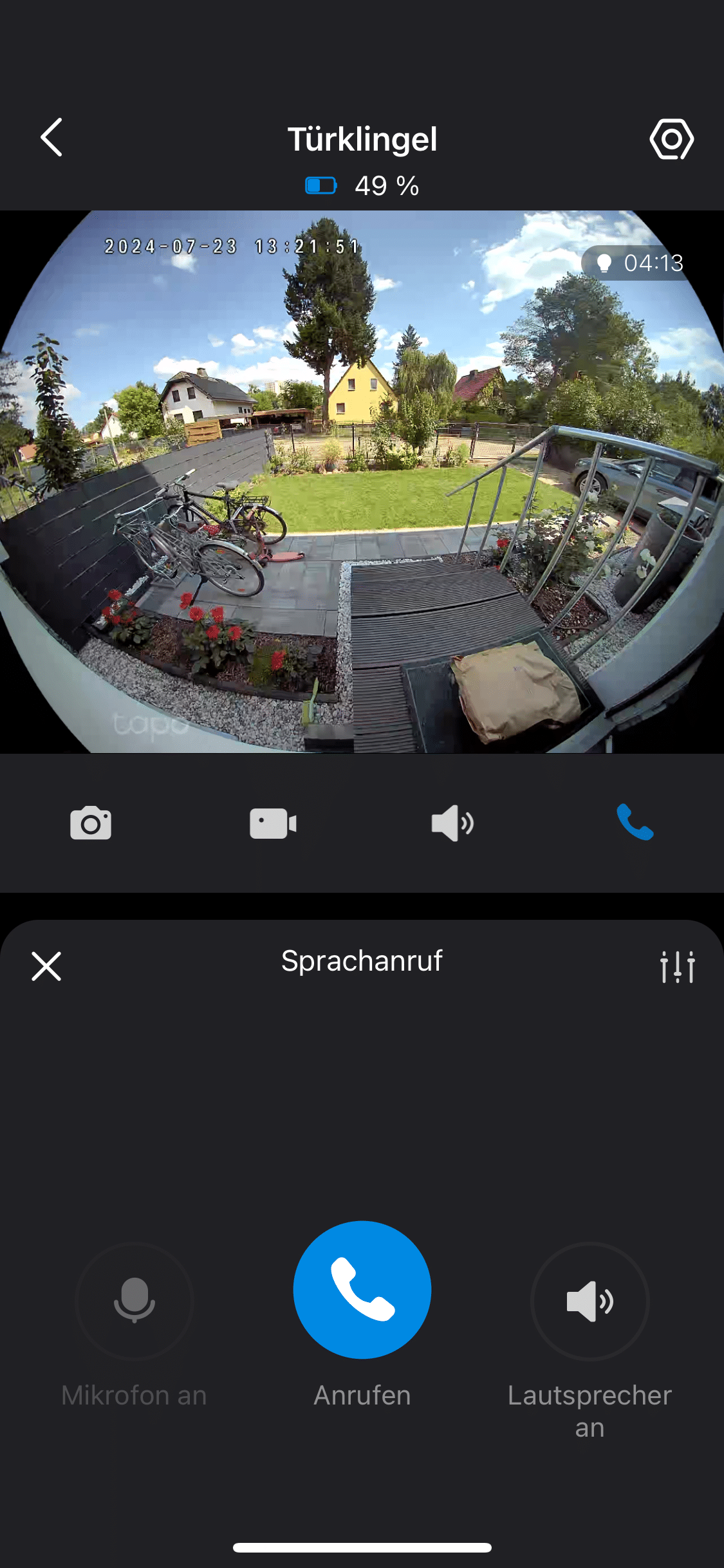 Auf der Startseite erkennst du die Live-Ansicht der Kamera. Darunter kannst du schnell und unkompliziert auf Shortcuts zugreifen. So lässt sich beispielsweise ein Foto schießen oder ein Video aufzeichnen. Weiterhin startest du hier das Zwei-Wege-Audio über das du mit deinem Besuch kommunizieren kannst. Die Performance von Mikrofon und Lautsprecher ist dabei recht gut. So kannst du beispielsweise von unterwegs den Paketboten darum bitten, die Sendung einfach im Garten abzustellen.