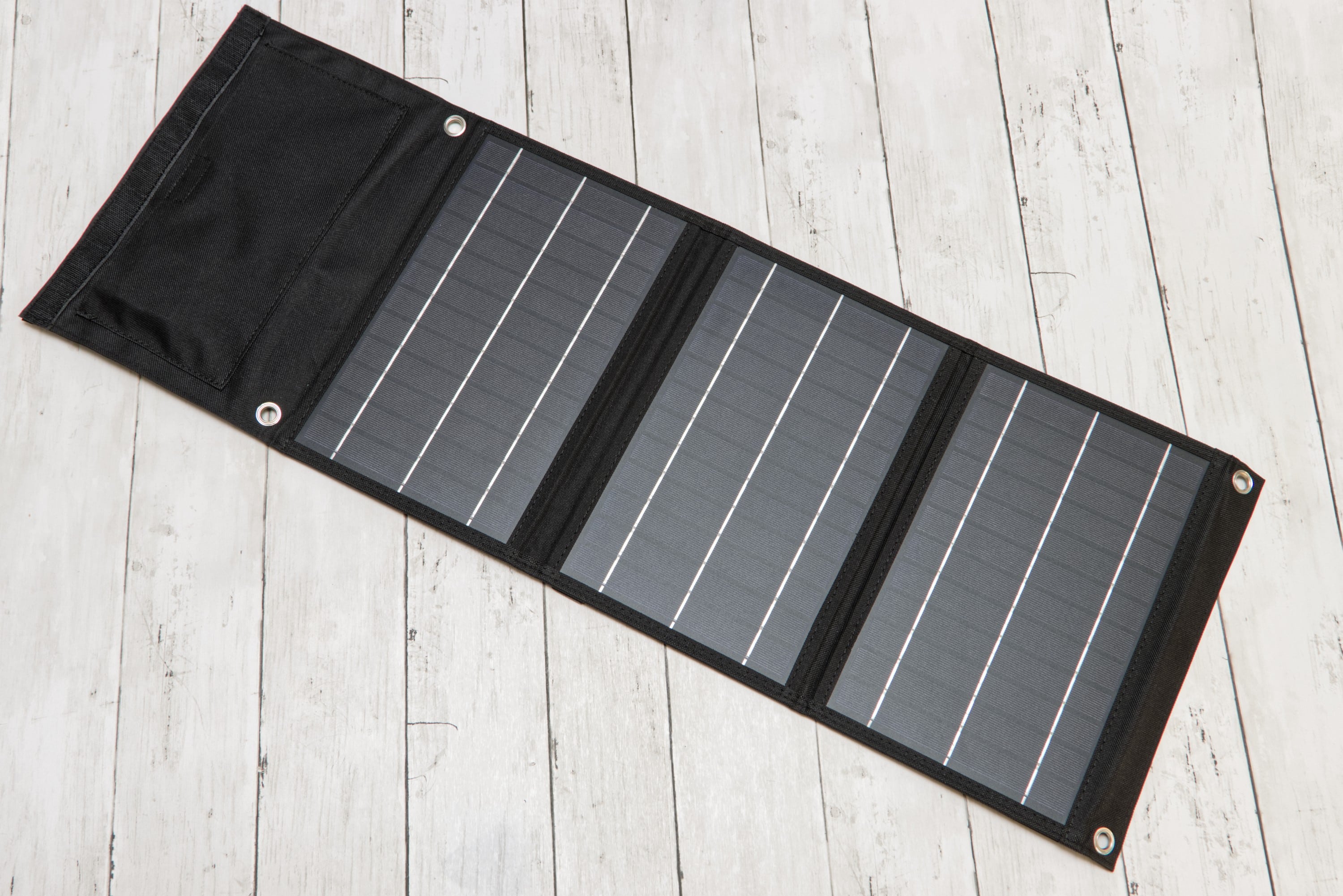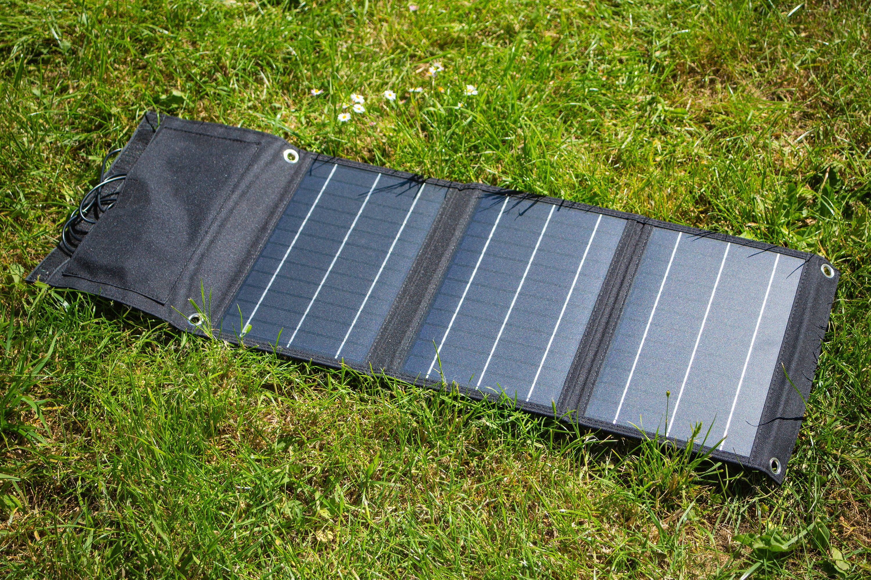 - Lang mit drei Solar-Segmenten und einer USB-Tasche im aufgeklappten Zustand