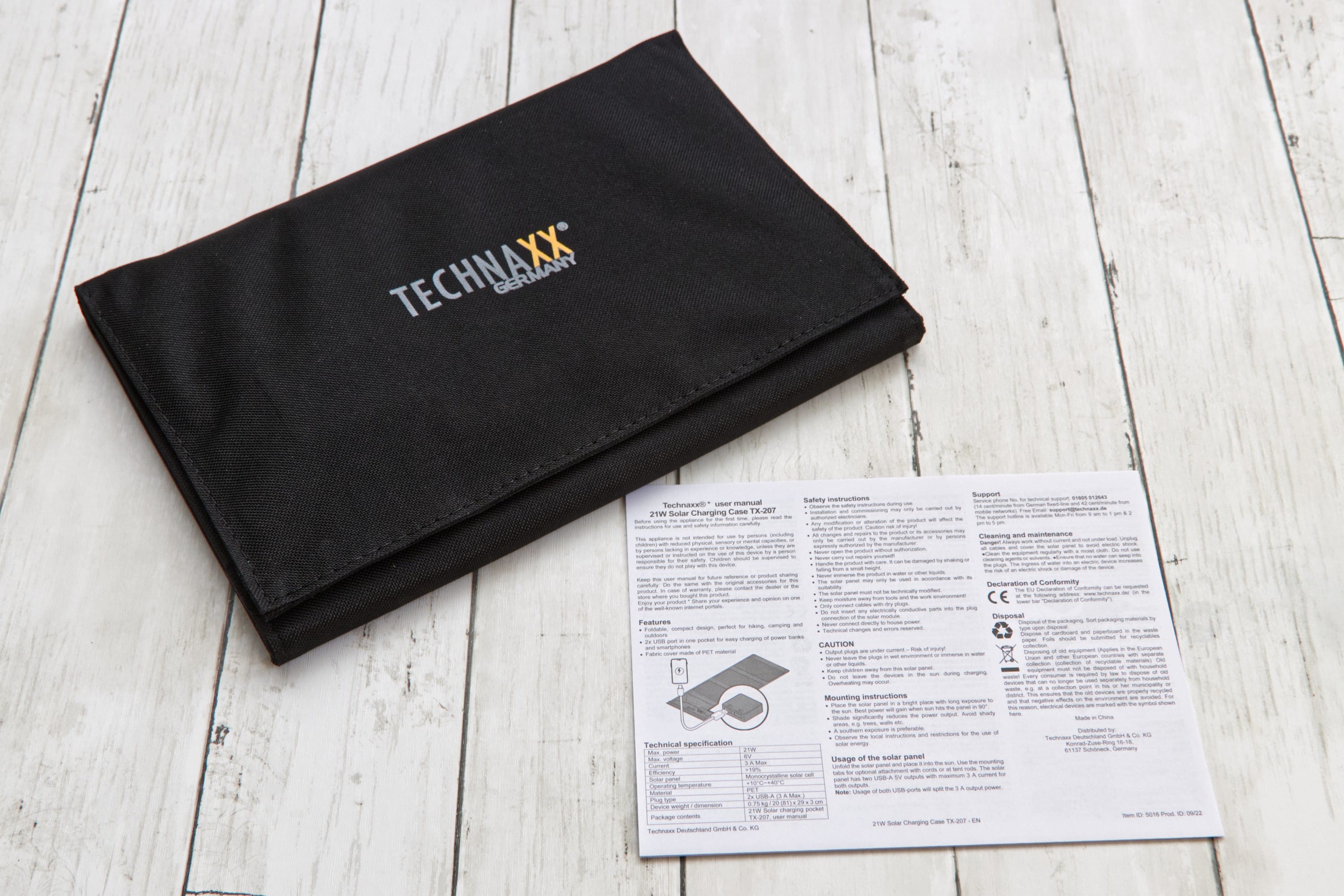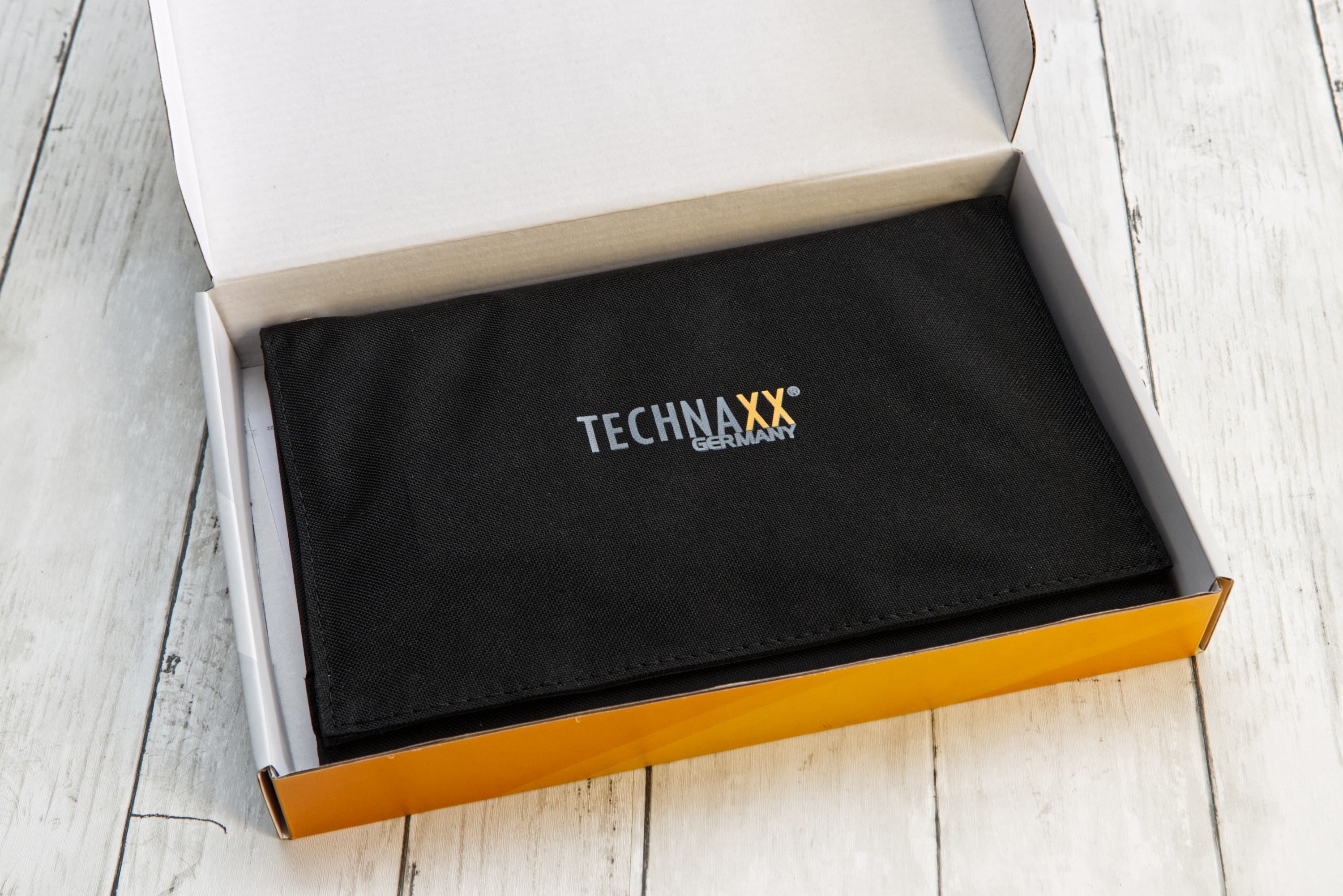 Die Technaxx 21W Solar Ladetasche TX-207 kommt in einem robusten, aber simplen Karton. Wenn man diesen öffnet, blickt man direkt auf die Technaxx TX-207-Ladetasche. Darunter liegt noch die mehrsprachige Anleitung – und das war’s mit dem Lieferumfang.
