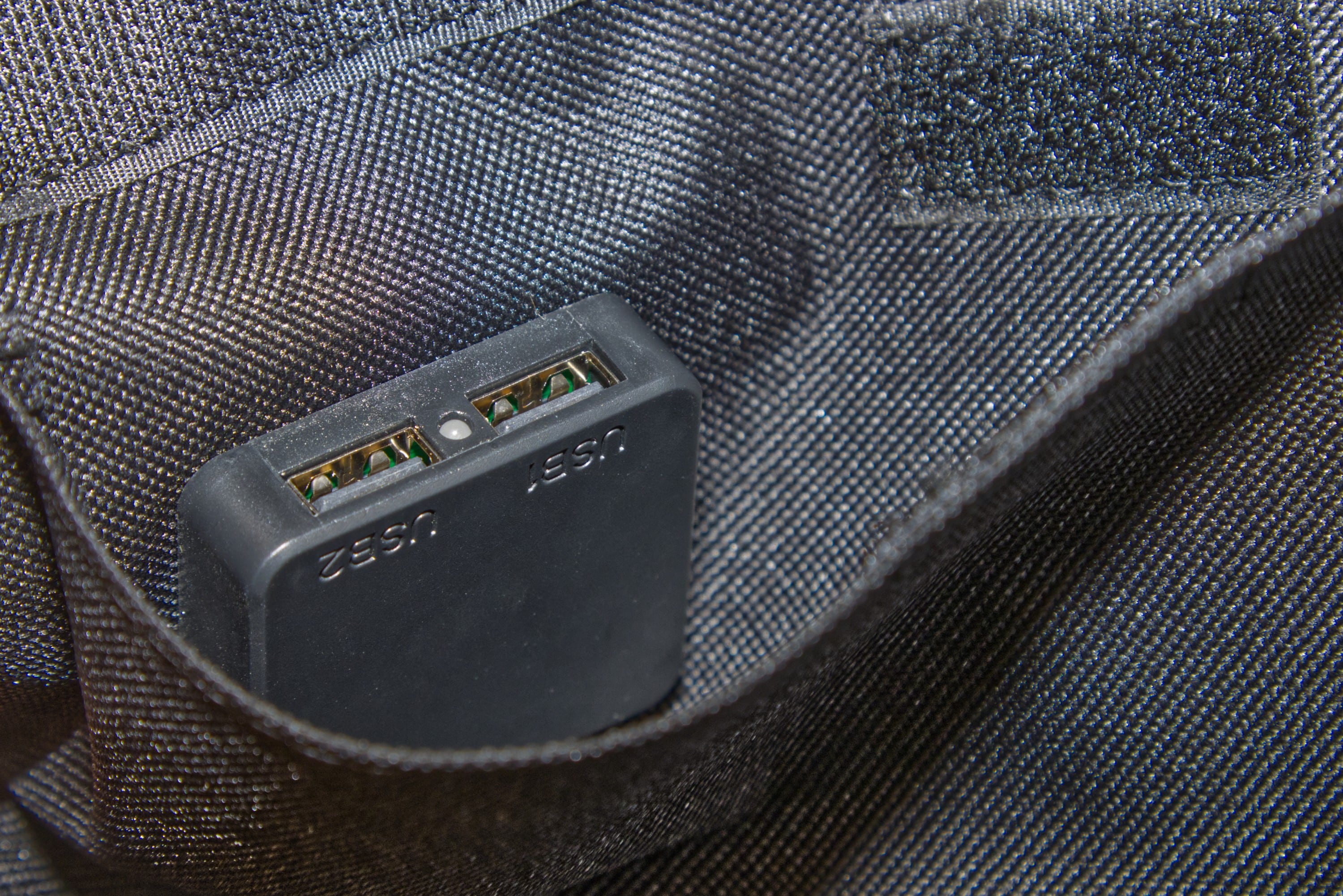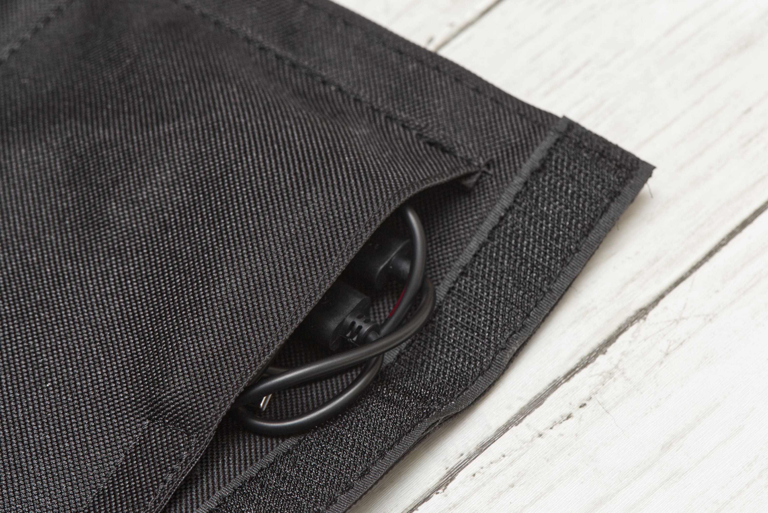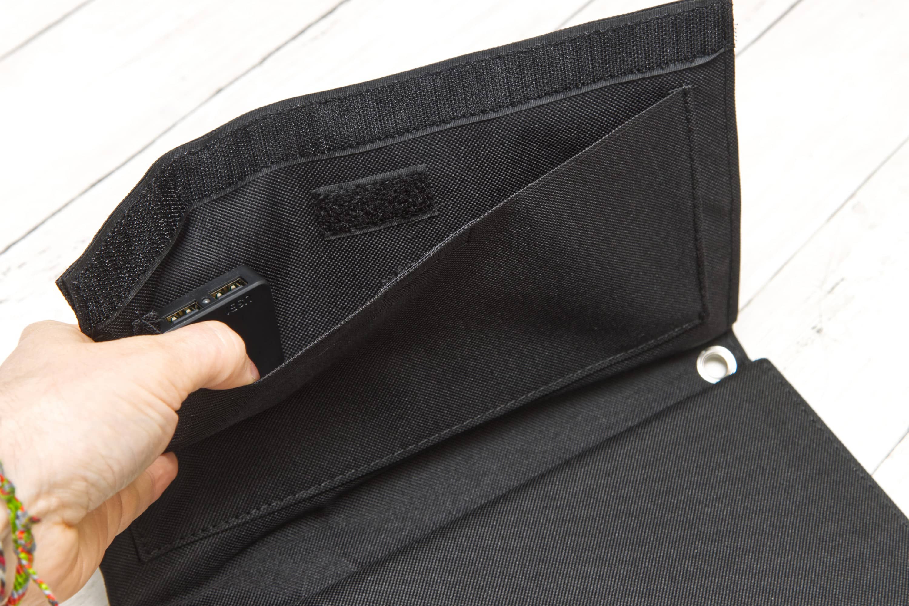 - Der Klettverschluss neben den USB-Anschlüssen ist etwas kurz
