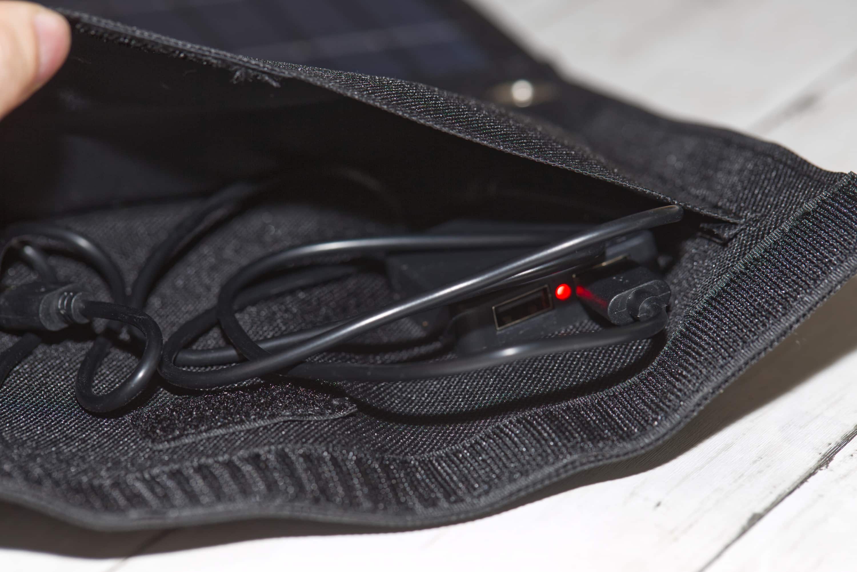 Ein wenig ungünstig finde ich die Position der USB-Anschlüsse in der kleinen Tasche. Wären diese ein bisschen tiefer in der Tasche, würden angeschlossene Kabel weniger mit dem Klettverschluss in Konflikt kommen. Apropos Klettverschluss: Ein kleines Kabel ist mir während des Tests aus der USB-Tasche gefallen, weil der Klettverschluss recht kurz ist. Habe es zwar wieder gefunden, aber es ist schade, wenn Kabel weder lose noch angeschlossen optimal in die kleine Tasche passen.