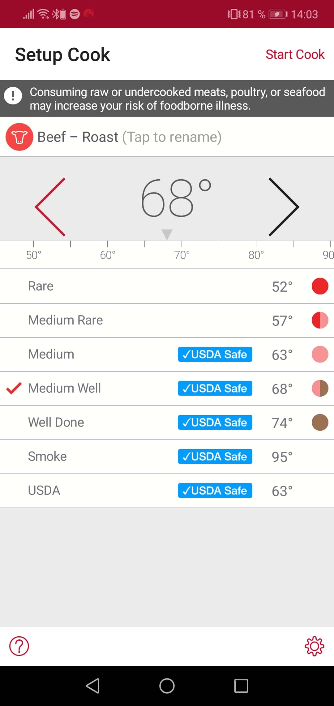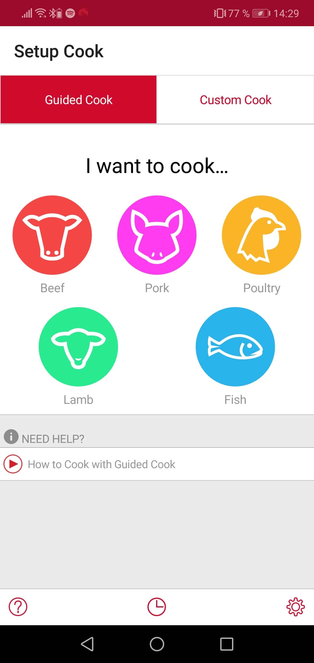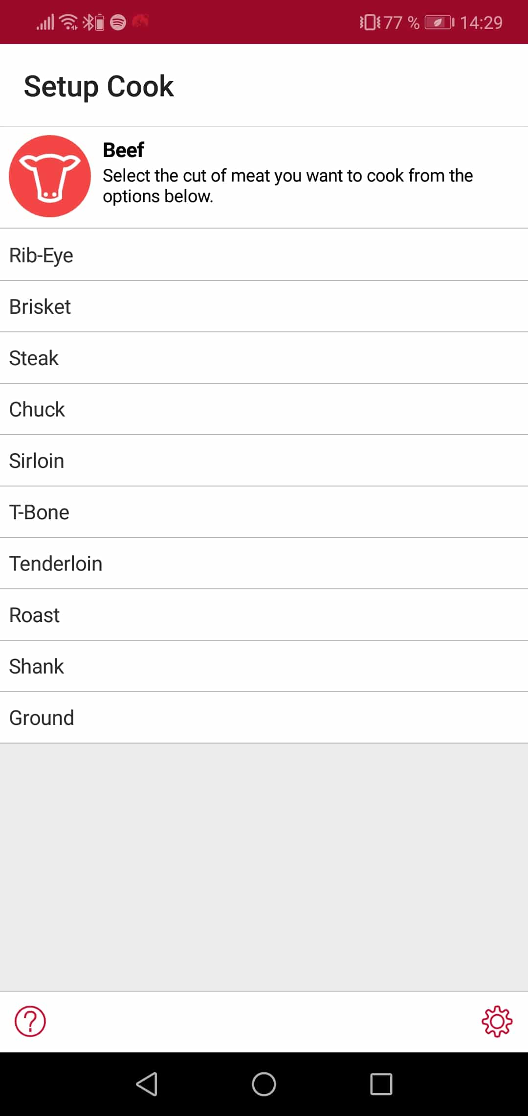 Der Grill ist vorgeheizt und unser Stück Fleisch ist bereit auf den Grill zu wandern. Zuerst wählen wir aus, welches Fleisch wir vor uns haben: Rind, Schwein, Geflügel, Lamm oder Fisch. Bei den verschiedenen Arten können wir auch noch wählen, welchen Teil wir genau vor uns haben. Beispielsweise beim Rind gibt es einiges an Auswahl. Falls das gewünschte Grillgut nicht vorhanden ist, können die Einstellungen auch selbst vorgenommen werden.