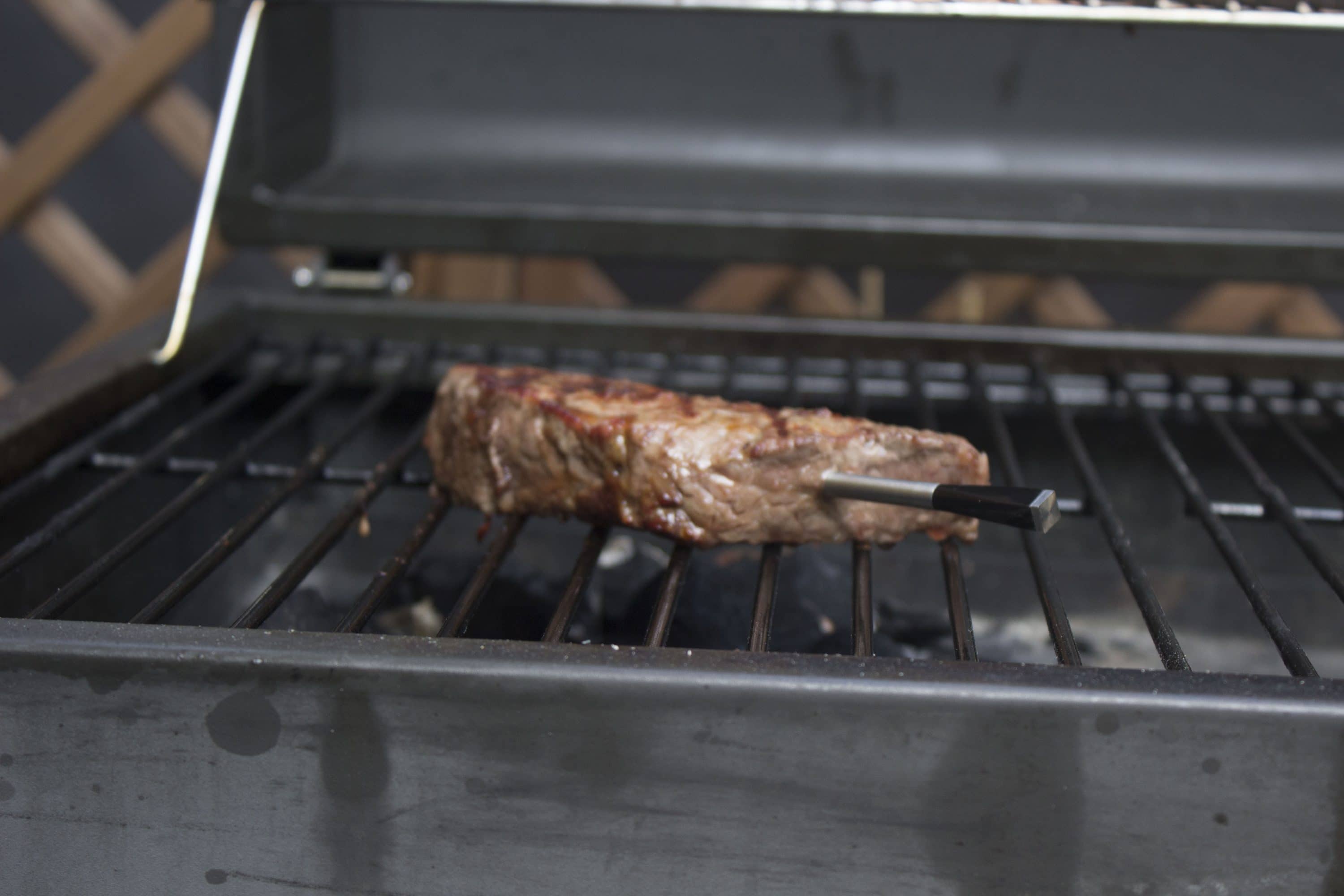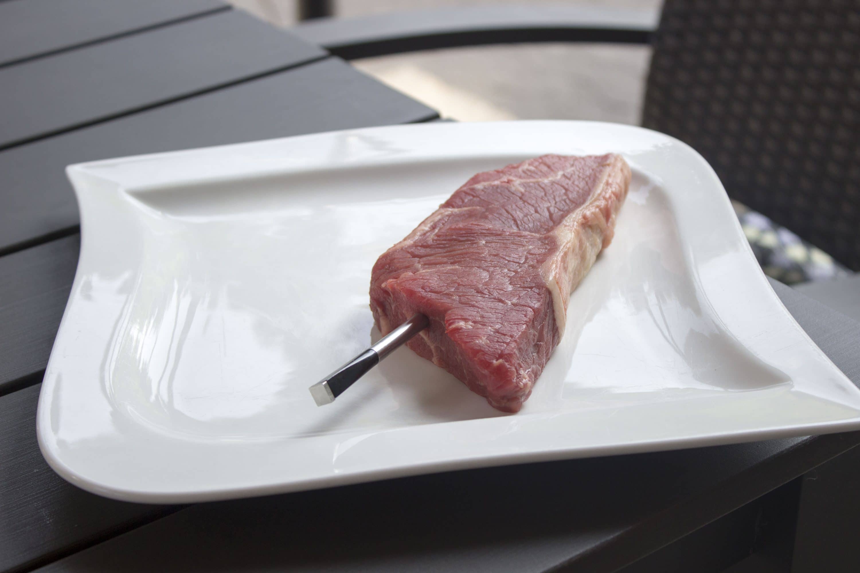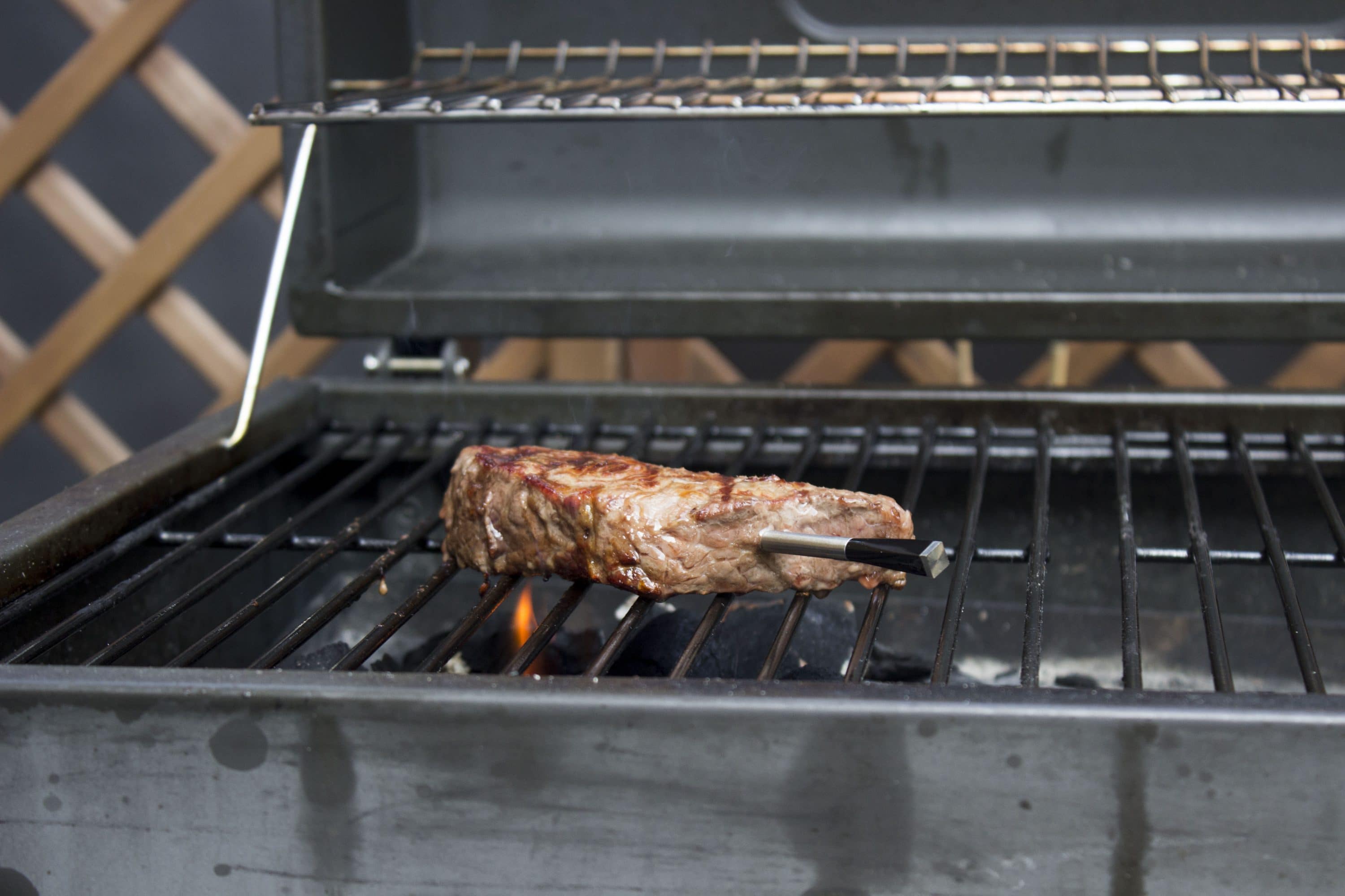 Wir möchten unser Steak natürlich erst scharf angrillen. Uns stellt sich die Frage: Hält der Meater die Hitze direkt über den Kohlen aus? Ja, das tut er. Bei geschlossenem Grill direkt über den Kohlen sind Temperaturen bis 300 Grad Celsius sicher keine Seltenheit. Laut Hersteller kann das Gadget bis 275 Grad Celsius ohne Probleme standhalten. Eine Überschreitung ist kein Problem, da die App eine Warnung ausgibt. Das erste Angrillen haben wir ohne den Meater vorgenommen und den Meater erst danach ins das Fleisch gesteckt und garen lassen.