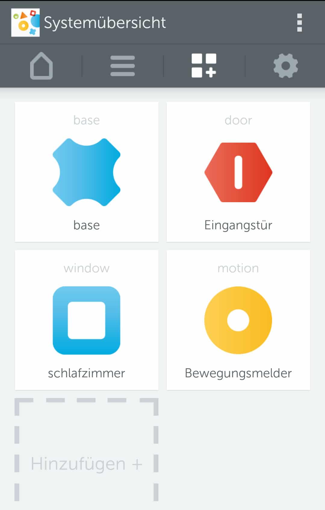 Nachdem man sich nun bei Gigaset registriert hat und die Basisstation angemeldet hat, kann man einzelne Sensoren hinzufügen. Dazu klickt man einfach in der Systemübersicht auf „Hinzufügen+„. Dann wird man einfach durch die Installation geführt, wie ihr auf den folgenden Bildern am Beispiel des Fenstersensors window sehen könnt.