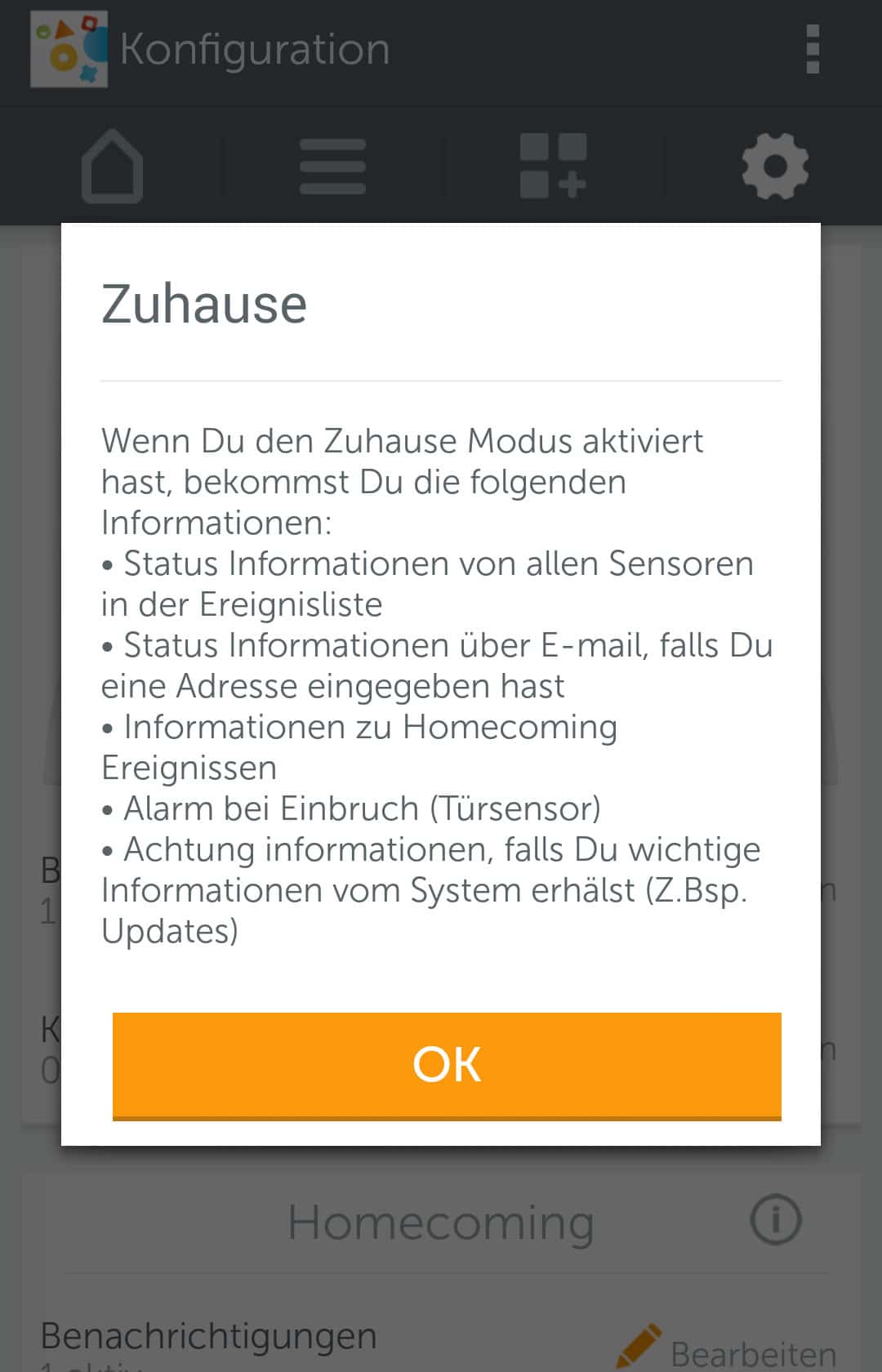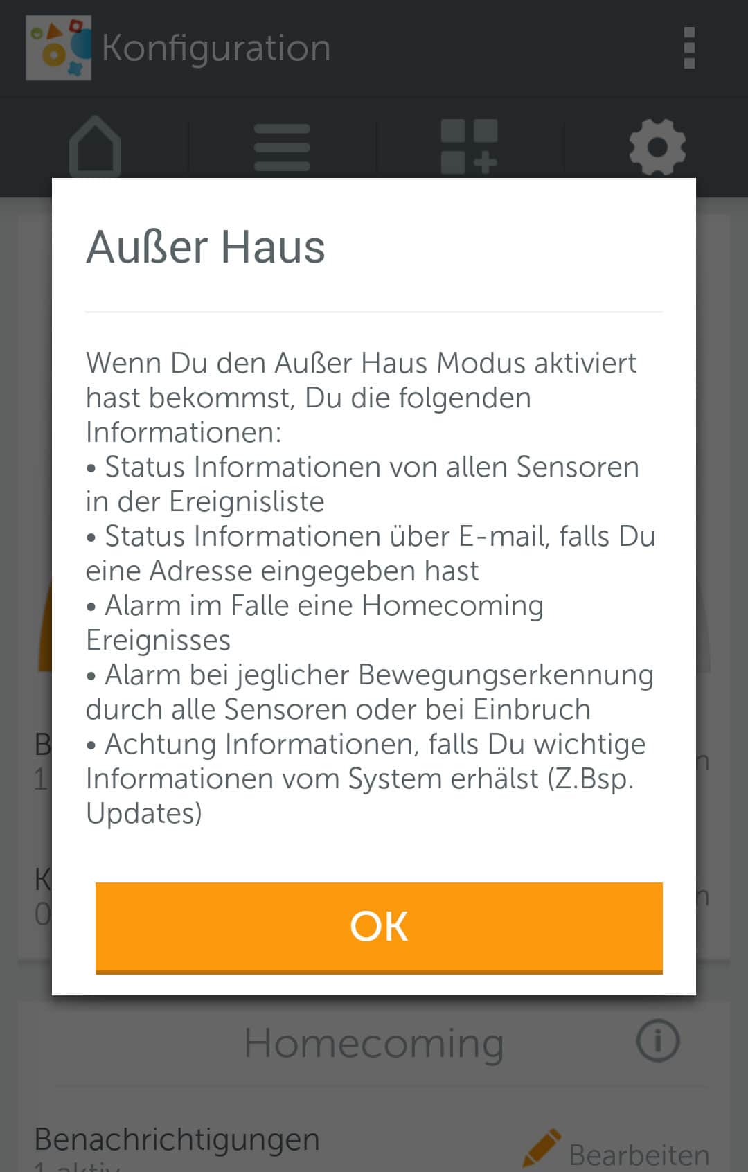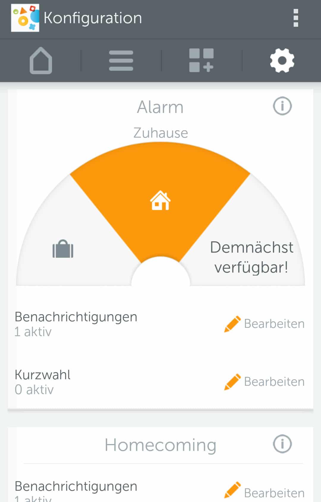 Die Funktionen von Gigaset elements lassen sich per App steuern. So lässt sich zwischen drei verschiedenen Modi wechseln. Zur Verfügung stehen „Zuhause„, „Außer Haus“ und „Individuell„. Sobald man die Einstellung „Außer Haus“ wählt, ist Gigaset elements scharf gestellt. Das heißt, sobald irgendein Sensor etwas registriert wird Alarm geschlagen. Dies geschieht zum einen per Push-Benachrichtigung, als auch per Email. In Zukunft sollen auch SMS-Benachrichtigungen möglich sein. Natürlich können auch mehrere Personen gleichzeitig benachrichtigt werden. Man muss auch nicht unbedingt immer das Smartphone zur Hand haben, denn über die Gigaset elements Webseite kann man auch alles überwachen und erhält einen guten Überblick.