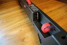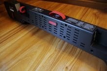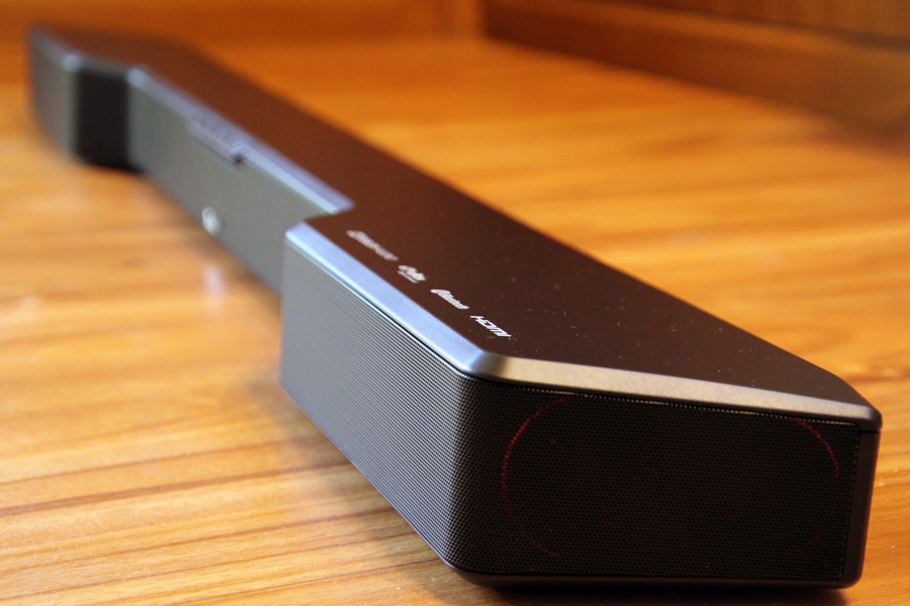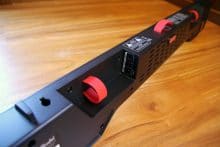 Es gibt keine störenden Elemente und auch „off“ macht die Soundbar etwas her. Der Subwoofer ist minimalistisch und modern designt. Die Speaker werden von roten Zierringen umfasst. Der rote Kontrast wird zudem durch Schlaufen an der Rück- und den Gummifüßen an der Unterseite weiterverfolgt. Das Design kann überzeugen.