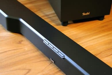 Wir finden bei der Cinebar das von Teufel bekannte Display hinter der Front vor. Die Anzeige versteckt sich hinter einer Zellulose-Beschichtung, die die gesamte Front umfasst. Sie kann gedimmt oder ganz ausgeschaltet werden.