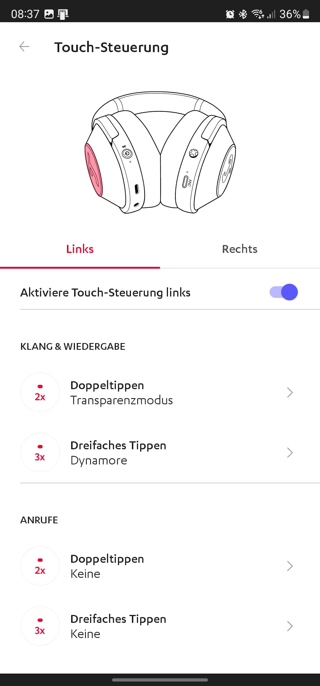 Zu guter Letzt verfügen beide Außenseiten der Ohrmuscheln über ein Sensorfeld, das via Touch-Bedienung den Wechsel in den Transparenzmodus oder das Hinzuschalten der Dynamore-Technologie ermöglicht. Sämtliche Bedienelemente lassen sich in der Begleit-App zudem an die eigenen Vorlieben anpassen, allgemein gefällt die Bedienung der Kopfhörer sehr gut.