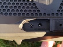 Oben im hinterem Bereich sind angenehm große Tasten zur Wiedergabe und Lautstärkeregelung. Hinten befinden sich oben Ein-/Ausschalter, die Tasten für den Outdoor-Modus, BT-Suche und Connect. Unten sind die Anschlüsse hinter Abdeckungen verborgen.