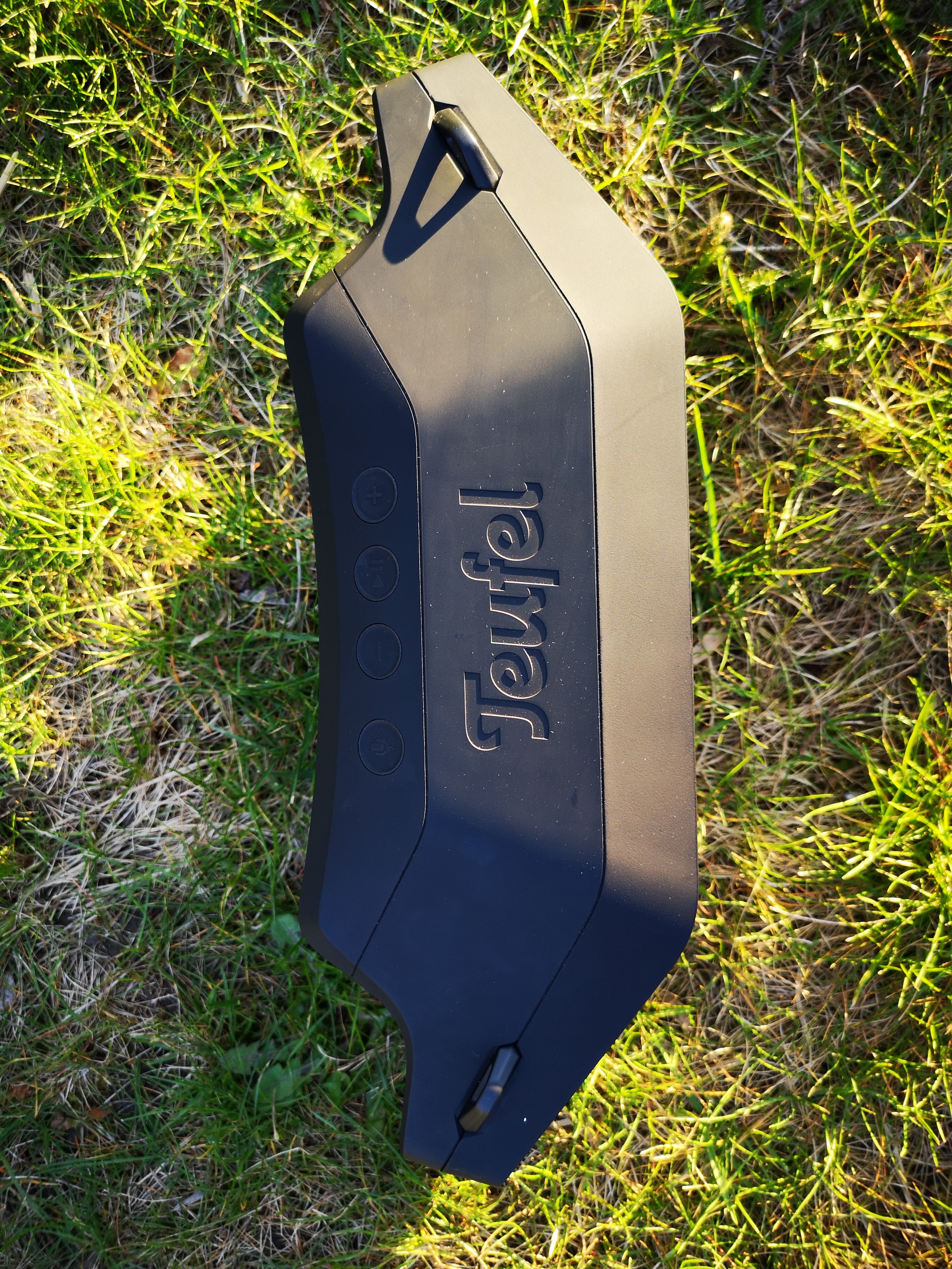 Teufel setzt auf ein eigenständiges und unkonventionelles Design. Erinnert ein wenig an ein zu groß geratenes Satellitentelefon aus den 80er-Jahren. Schauen wir uns aber die Halterungen für die Tragegurte an, erschließt sich sofort der Sinn der leicht gebogenen Formgebung. Das Ding kann man tragen und die kleine Rundung der Rückseite passt prima zum Körper.