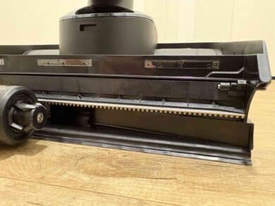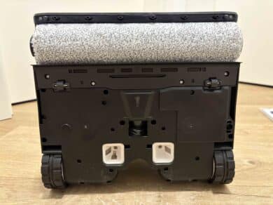 Obendrein übt der Tank zusätzlichen Druck auf die Reinigungswalze aus, was für einen guten Schwerpunkt und bessere Reinigung sorgt. Schaut man sich die Reinigungseinheit dann einmal von unten an, fällt das randlose Design der Bürste auf. Ein dahinter befindlicher Kamm soll Haare aus der Bürste lösen.