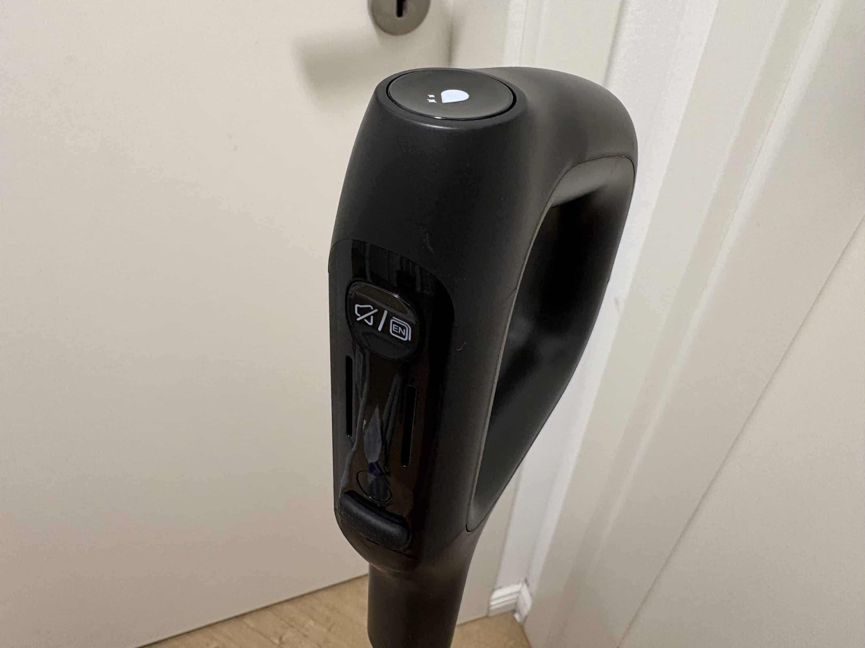 Über den Rückseitigen Knopf steuert ihr die Sprachausgabe, über den Knopf oben startet ihr die Selbstreinigung sobald sich das Gerät in der Ladestation befindet. Der Handgriff mündet in die Haupteinheit. Auf deren Oberseite sitzt ein gut ablesbares Display, welches euch Auskunft über die wichtigsten Parameter gibt.