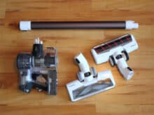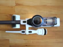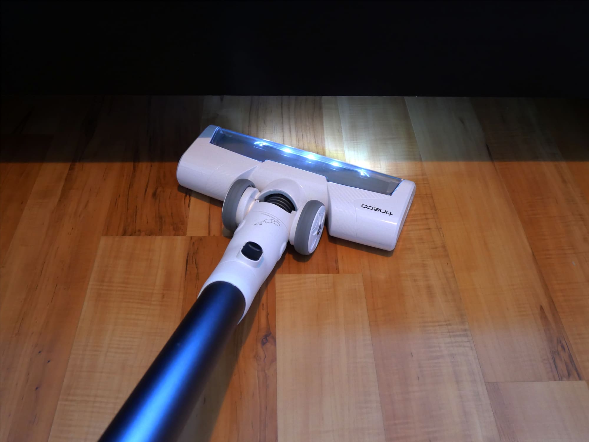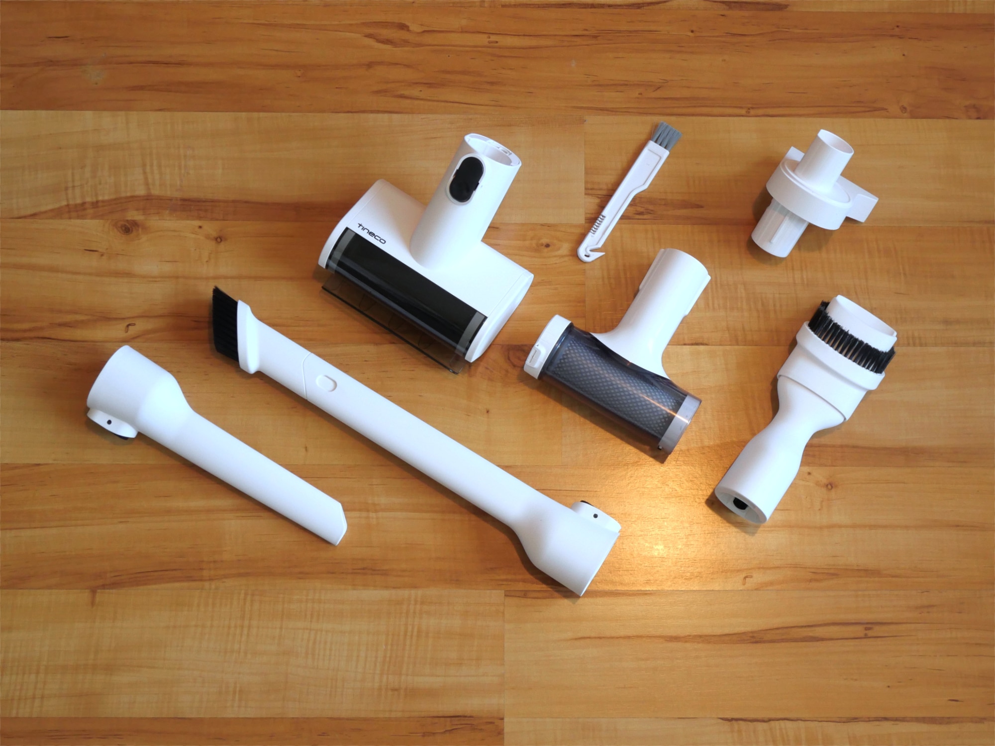 Kommen wir nun zum Wichtigsten, der Reinigungsleistung. Der Tineco Pure One S11 Tango EX leistete mit der LED-Multifunktionbürste auf Laminat, Fliesen und auch Teppich sehr gute Arbeit. Die ebenfalls im Lieferumfang enthaltene LED-Hartbodenbürste erzielte ebenfalls sehr gute Reinigungsergebnisse, aus Komfortgründen verwendeten wir aber überwiegend die Multifunktionbürste. Auch die weiteren Aufsätze konnten im Test überzeugen. Mit der Mini-Turbobürste, der breiten 2-in-1-Staubbürste und den schmalen Fugendüsen deckt Tineco die wohl wichtigsten Anwendungsfälle ab. Praktischerweise lässt sich der Akkusauger auch, ohne Saugrohr, als Handsauger verwenden, was bspw. beim Absaugen von Bett und Couch mit der Mini-Turbobürste sehr hilfreich ist.