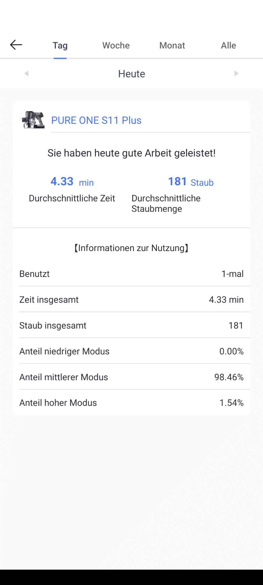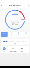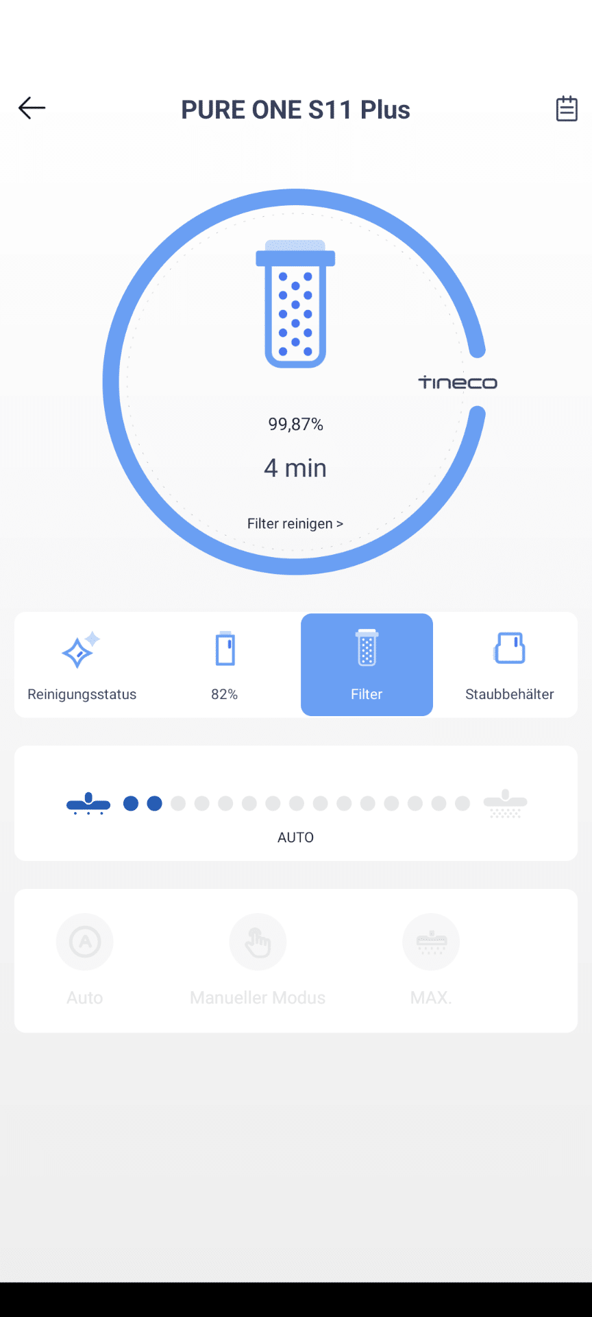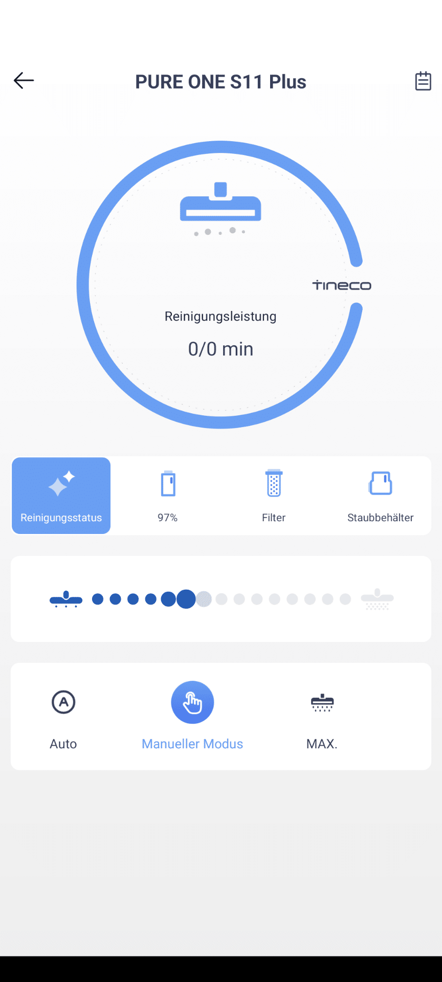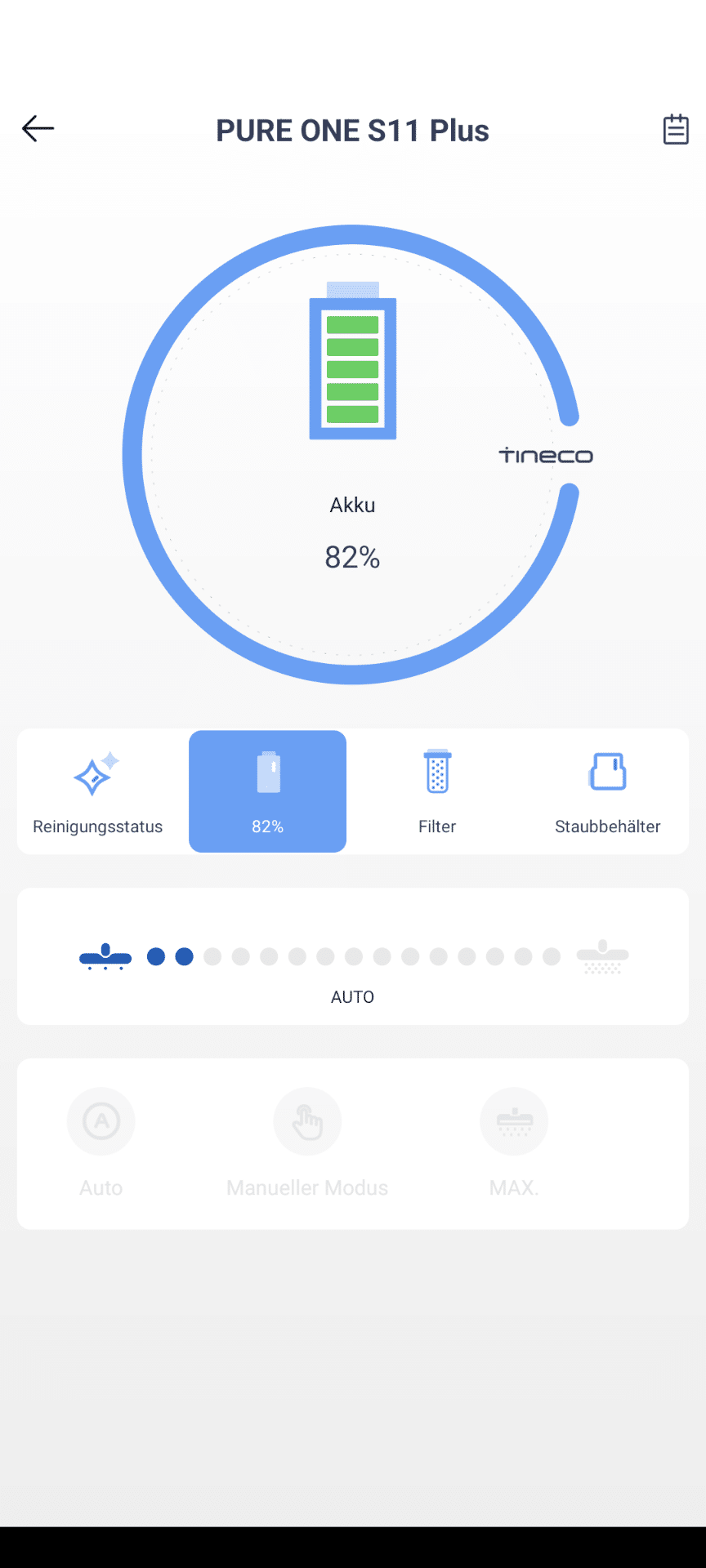 Nach der erfolgreichen Kopplung stehen weitere Funktionen und Einstellungen für den Akkusauger zur Verfügung. Die Oberfläche ist aufgeräumt und umfasst die vier Tabs Reinigungsstatus, Akku, Filter und Staubbehälter. Der Tab Reinigungsleistung enthält den, vom Display bekannten, Staubkontrollring, zudem kann man bei der Saugleistung zwischen auto, manuell (15 Stufen) und maximaler Leistung wählen. Die weiteren Tabs enthalten nur wenige Informationen und zeigen den Akkustand an, bzw. wann der der Filter oder Staubbehälter gereinigt werden muss. Oben rechts findet man zudem ein Kalendersymbol über das man zu Reinigungsstatistiken für den Tag, die Woche, den Monat oder auch die gesamte Nutzungsdauer gelangt.