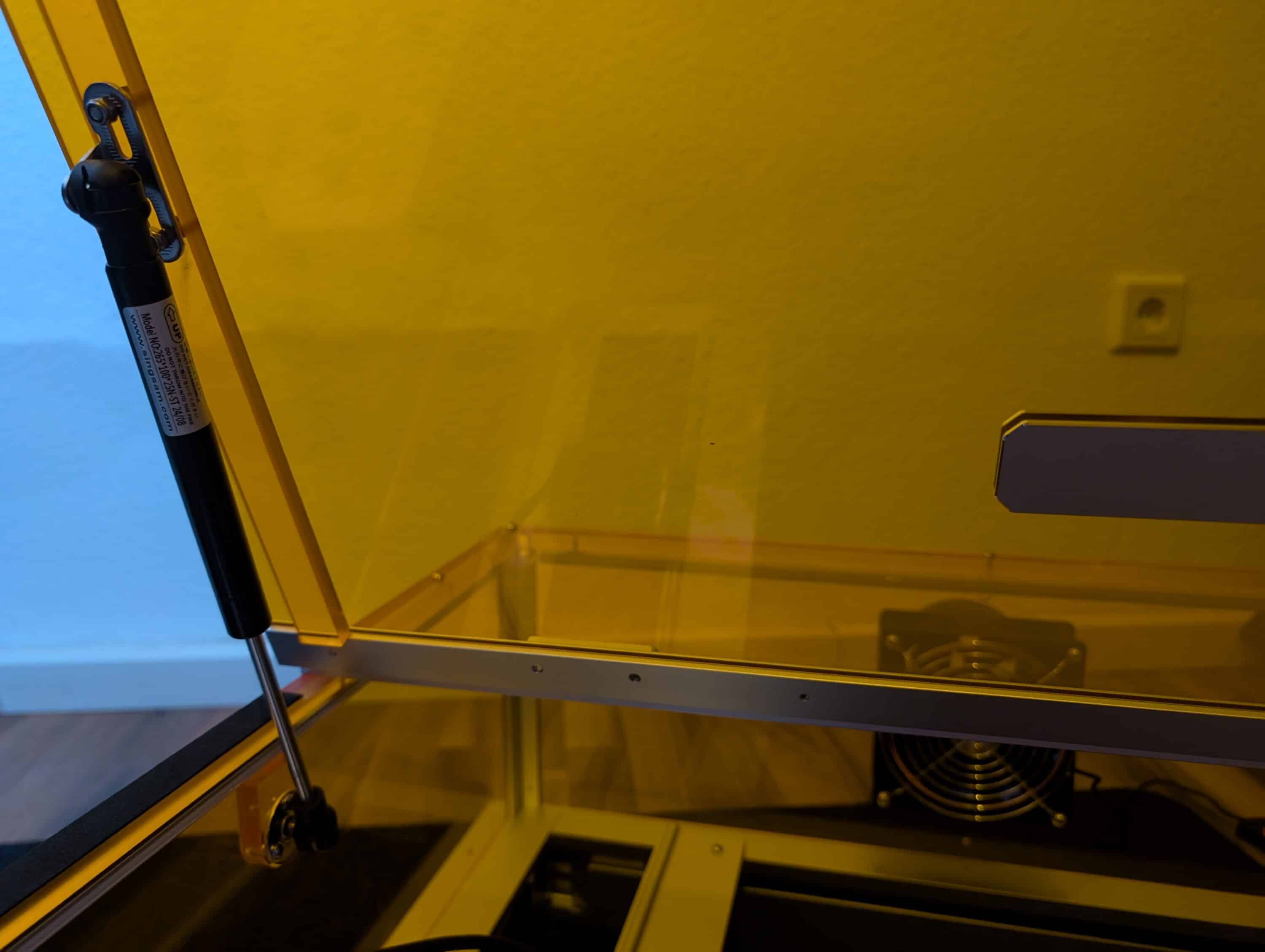 Clever gelöst ist außerdem die Resume-Funktion bei kurzen Unterbrechungen: Klappe auf für einen schnellen Blick aufs Werkstück, Klappe zu, und der Laser macht an exakt derselben Stelle weiter. Die LED-Beleuchtung hilft dabei, auch wenn sie nicht übermäßig hell ist. Für Zwischenkorrekturen oder den Fortschrittscheck reicht es aber durchaus.