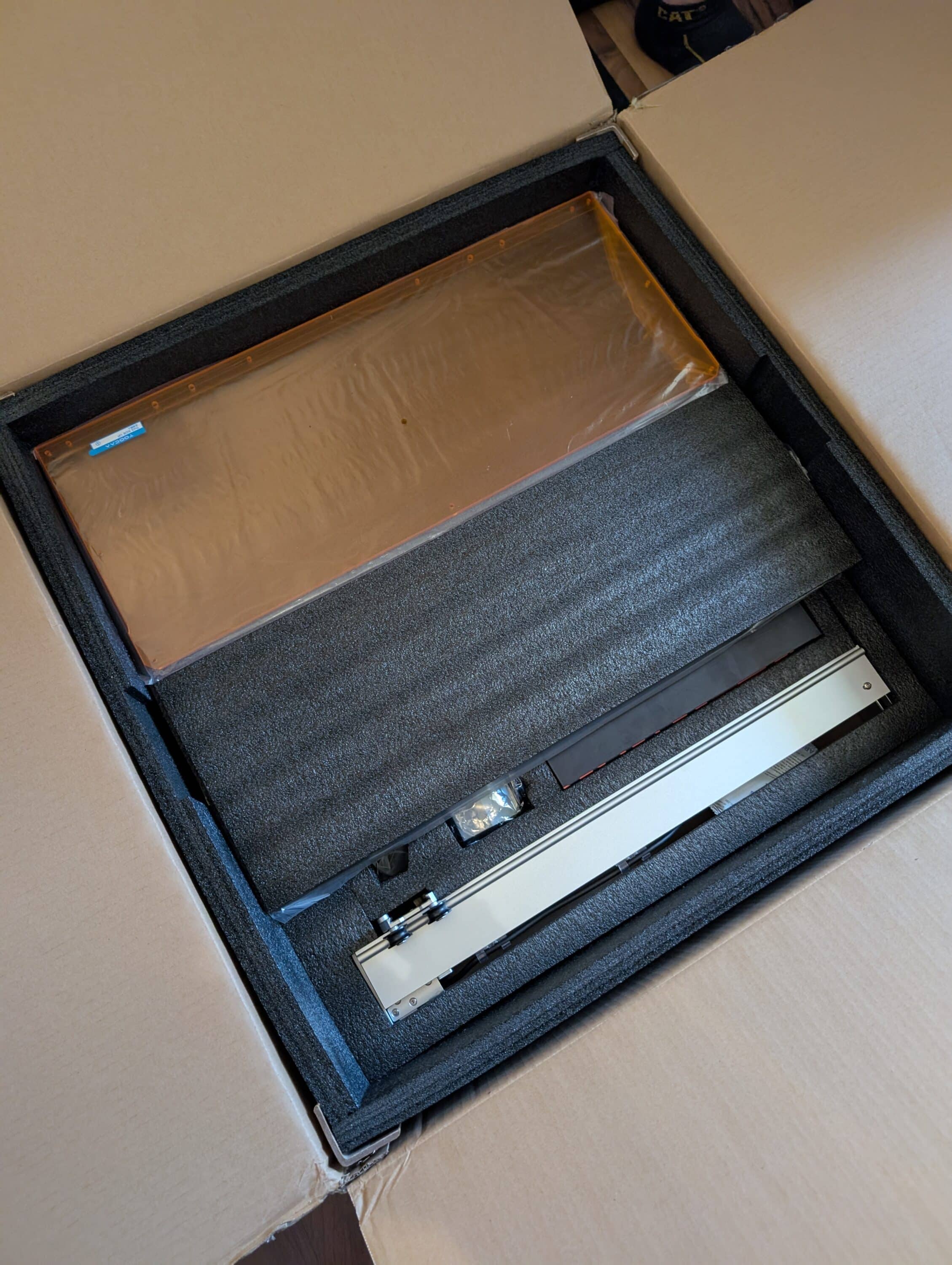 Die Verpackung ist extrem gut durchdacht – jedes Teil hat seinen Platz im Schaumstoff, wodurch nichts verrutschen kann. Das 13 Kilogramm schwere Grundgerät kommt außerdem weitgehend vormontiert, während nur die sechs orangefarbenen Acrylglaspaneele und diverse Kleinteile auf die Montage warten.