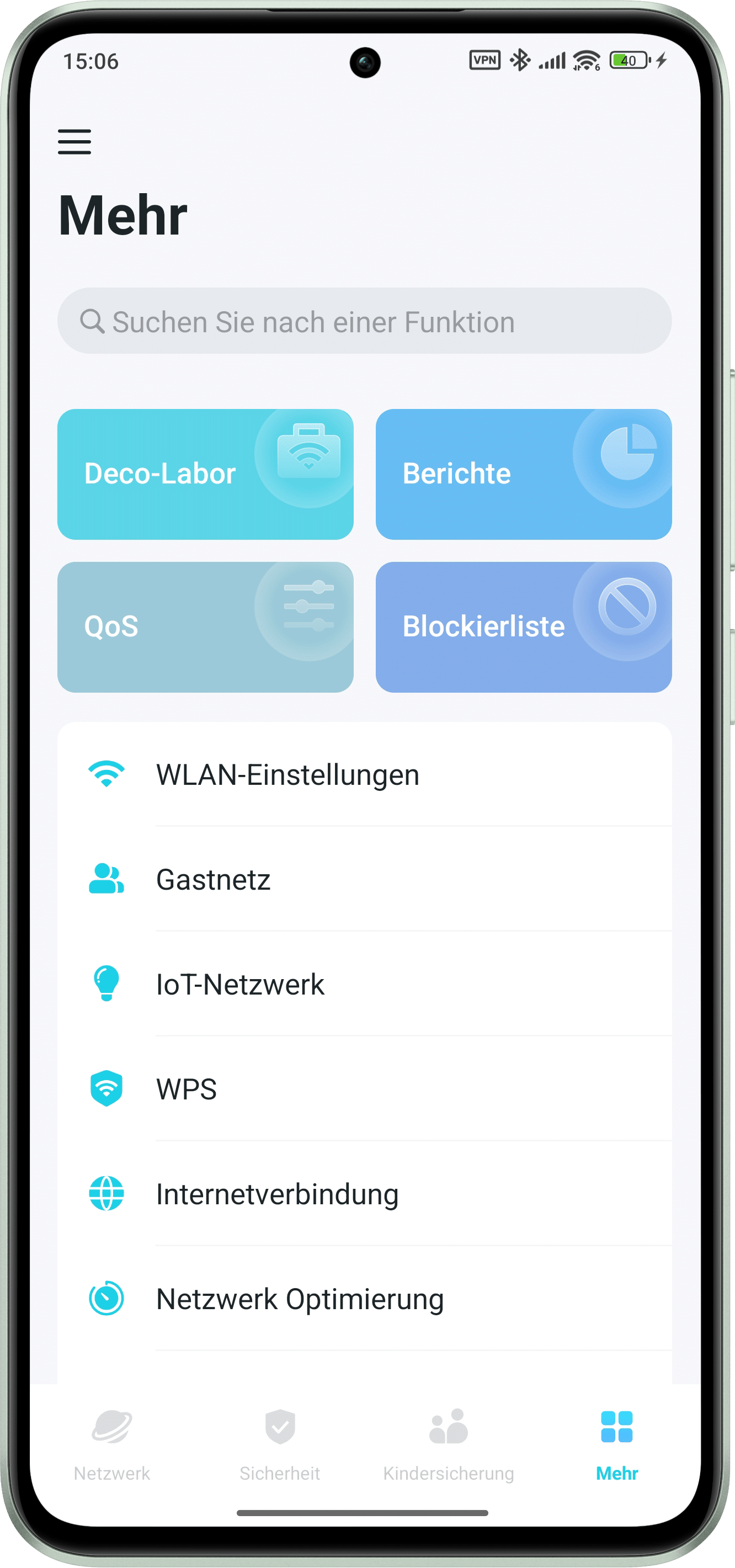 Für die Konfiguration ist in der Regel die Deco-App das zentrale Herzstück. Dabei zeichnet sie sich durch ein modernes, gut strukturiertes Interface aus, sodass sich selbst Technikneulinge leicht zurechtfinden sollten. Denn auch nach dem initialen Setup bleibt die App der Dreh- und Angelpunkt. Das liegt daran, dass sie eine Vielzahl von Einstellungsmöglichkeiten bereithält, ohne überladen zu wirken. Im Bereich „Netzwerk” erhält man einen ersten Überblick über die angeschlossenen Decos samt Netzwerktopologie und der damit verbundenen Geräte. Bei Bedarf steht auch gleich ein Speedtest zur Verfügung und das bestehende WLAN kann hier entsprechend angepasst werden.