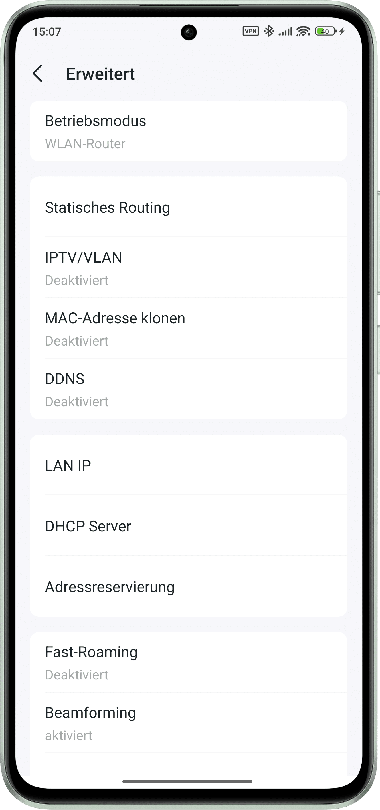 Unter dem Menüpunkt „Mehr“ stehen zahlreiche weitere Funktionen zur Verfügung, darunter die Einrichtung eines Gastnetzwerks oder eines Netzwerks für IoT-Geräte sowie die kurzzeitige Aktivierung von WPS eines Decos. Einzig der wenig aussagekräftige Punkt „Erweitert” ist zunächst etwas irritierend. Hier verbirgt sich unter anderem die Einstellung der Betriebsmodi, wie beispielsweise Router- oder Access Point-Modus. Hinzu kommen die Features Beamforming und Fast-Roaming, von denen einige ab Werk noch deaktiviert sind. Wir empfehlen daher, zunächst einen Blick in die Optionen zu werfen und bei Bedarf Anpassungen zu treffen, um die WLAN-Performance zu optimieren.