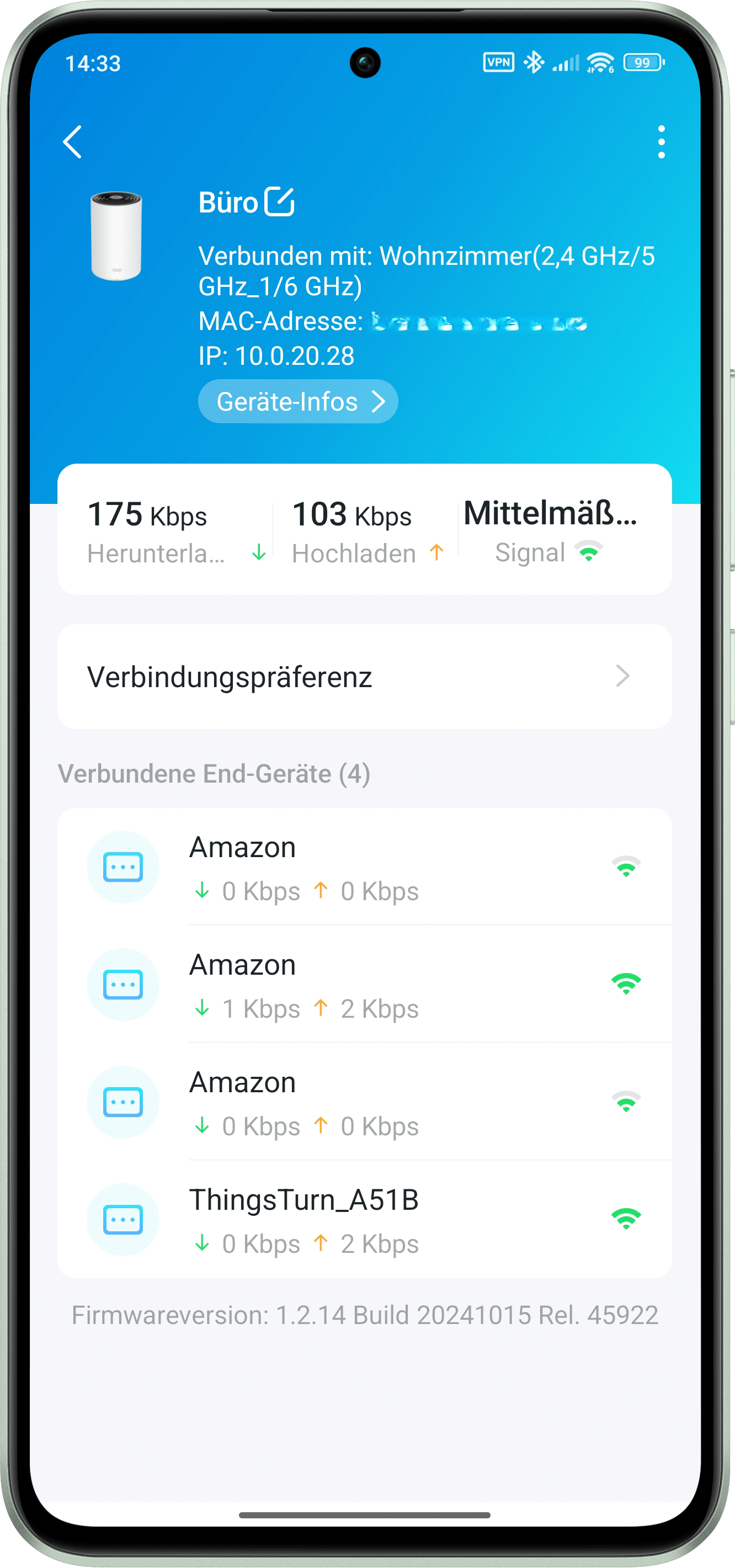 Ein merklich schlechteres Signal ließ sich lediglich im Kellerbereich verzeichnen, was angesichts der Tatsache, dass Betonwände Signale abschotten, nicht überraschend ist. Ungeachtet dessen gelingt die Abdeckung auch für größere Entfernungen, sodass im Außenbereich, sei es Pool oder Garten, ebenfalls eine konstante Verbindung verfügbar ist. Selbst die Poolroboter nutzen während des Reinigungsgangs ohne Probleme das WLAN, solange sie sich über Wasser befinden. Im direkten Vergleich mit unserem Referenzmodell Deco BE65 (unser Test) mit WiFi 7 musste sich der XE75 am Ende doch geschlagen geben, da das Signal dort noch einmal „eine Ecke besser“ war.
