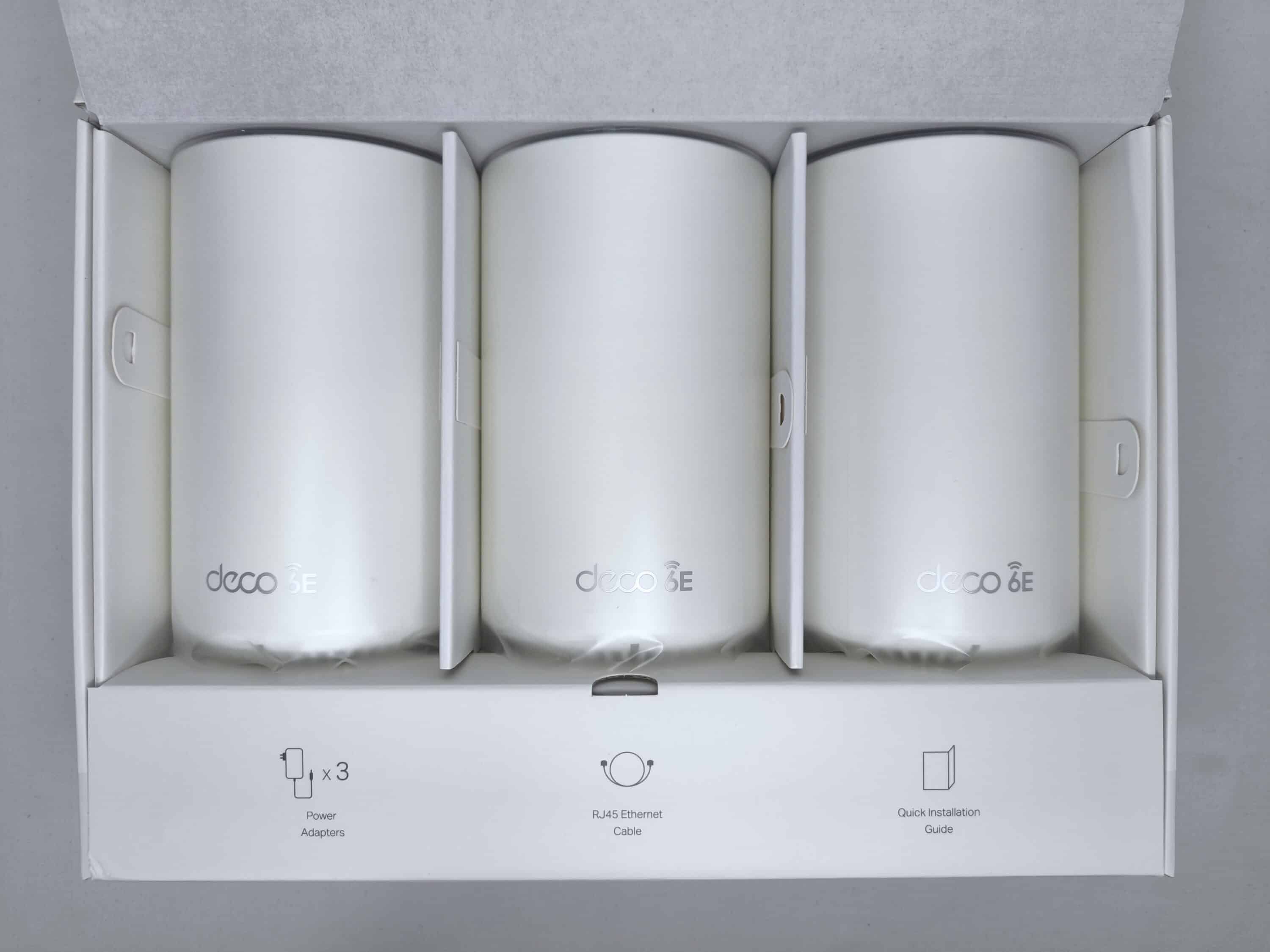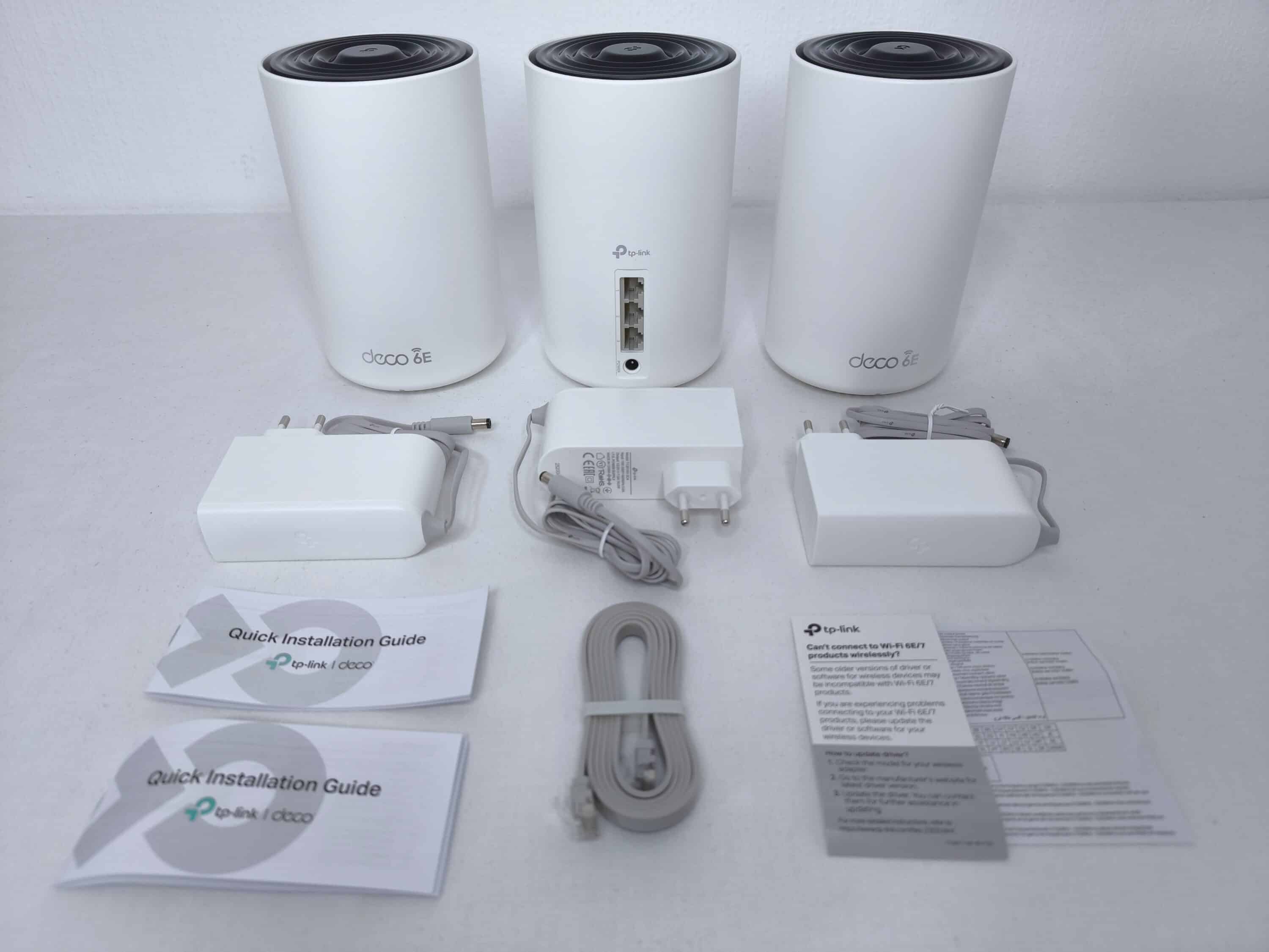 Das TP-Link Deco X75 Set besteht aus drei Deco-Einheiten, drei Netzteilen und einem RJ45 Ethernet-Kabel. Damit eine optimale Verbindung gewährleistet ist, sollte mindestens bzw. idealerweise gleich mehrere Deco-Einheiten per LAN verbunden sein. Vervollständigt wird das Paket durch den üblichen Satz an Dokumenten, bestehend aus einer Schnellstartanleitung und einzelnen Info-Blättern.