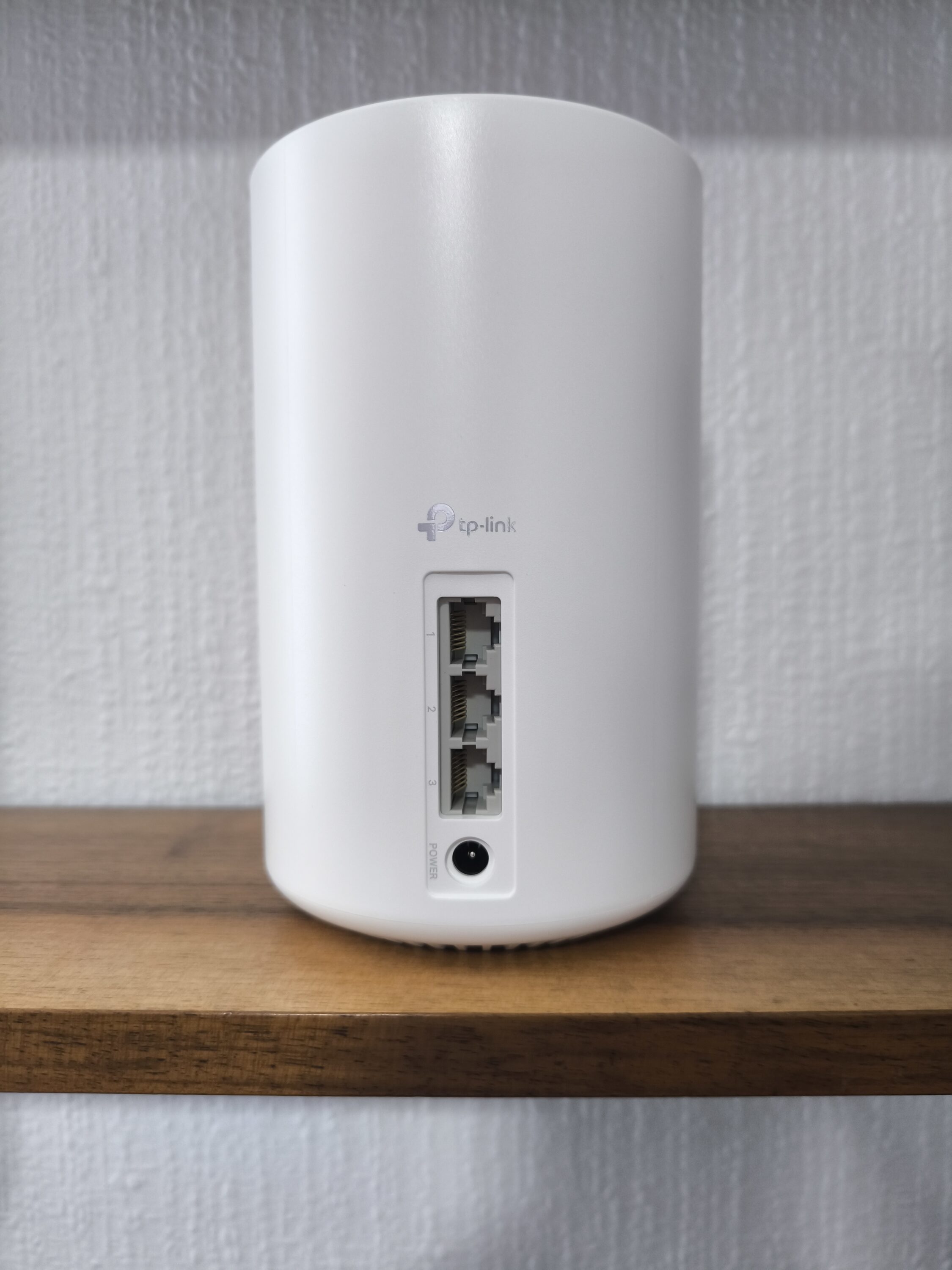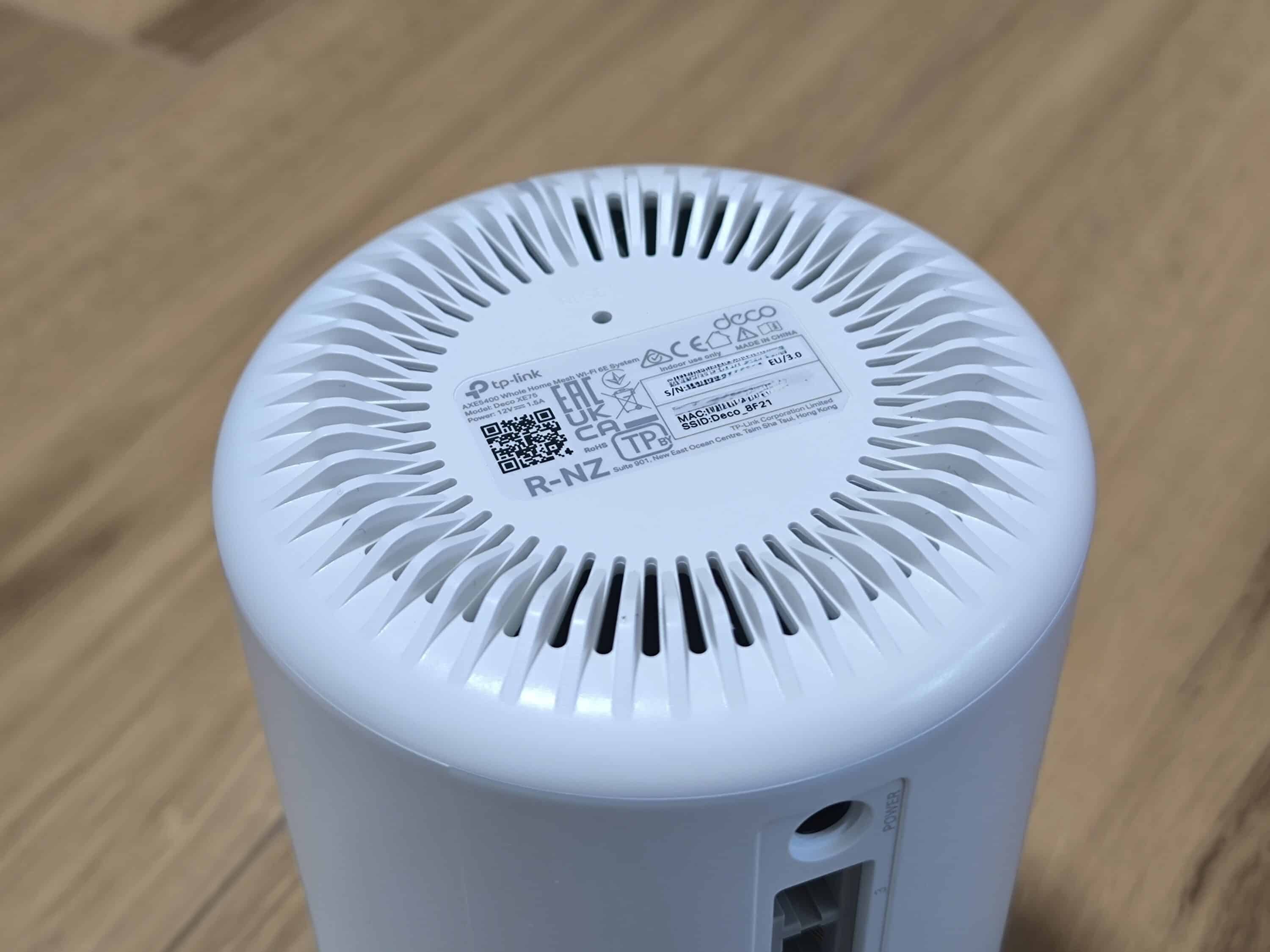 Was die Anschlüsse angeht, so verteilen sich diese allesamt auf der Geräterückseite. Im Einzelnen bedeutet dies drei Gigabit-Ports und als unterste Option den Netzanschluss. Anders als bei der Deco BE-Serie finden wir hier hingegen keinen WPS-Schalter. Werfen wir einen Blick auf die Unterseite, so kommen neben den Gerätekennzeichnungen auch der Reset-Button zum Vorschein. Kaum sichtbar unter dem Deco-Schriftzug auf der Vorderseite sitzt die kleine LED-Leuchte, welche den Zustand des Systems als Orientierungshilfe darstellt. Während des Startvorgangs leuchtet sie gelb und während des Einrichtungsprozesses blinkt sie blau. Besteht eine Verbindung zum Internet, leuchtet die LED durchgehend blau. Bei einer stabilen Internetverbindung erstrahlt die Leuchtdiode wiederum grün. Sollte nach der Einrichtung ein Problem mit der Verbindung auftreten, wird dies in einem dauerhaften Rot angezeigt. Auf diese Weise ist jederzeit klar erkennbar, in welchem Stadium sich der Deco XE75 befindet.