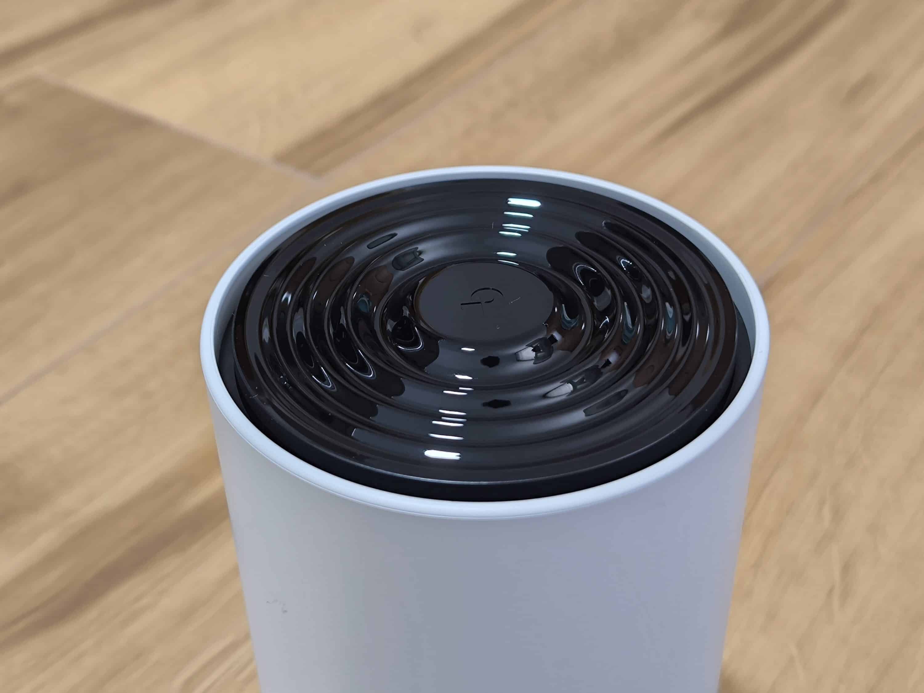 Im Gegensatz zu den X1500 (unser Test) präsentieren sich die TP-Link Deco XE75 in einem gehobeneren Design, während die zylindrische Form und die matt-weiße Oberfläche weitestgehend beibehalten werden. Besonders markant fällt der schwarz glänzende Deckel ins Auge, auf dessen kreisrunder Fläche ein grillartiges Muster mit zentral gesetztem TP-Link-Logo sitzt. Mit dieser Farbgebung hebt sich der XE75 deutlich von der ansonsten rein weißen Gerätereihe ab. Ähnliche Designs findet man eher im Bereich smarter Lautsprecher. Doch auch unabhängig davon vermittelt der XE75 eine Kombination aus Minimalismus und Ästhetik.
