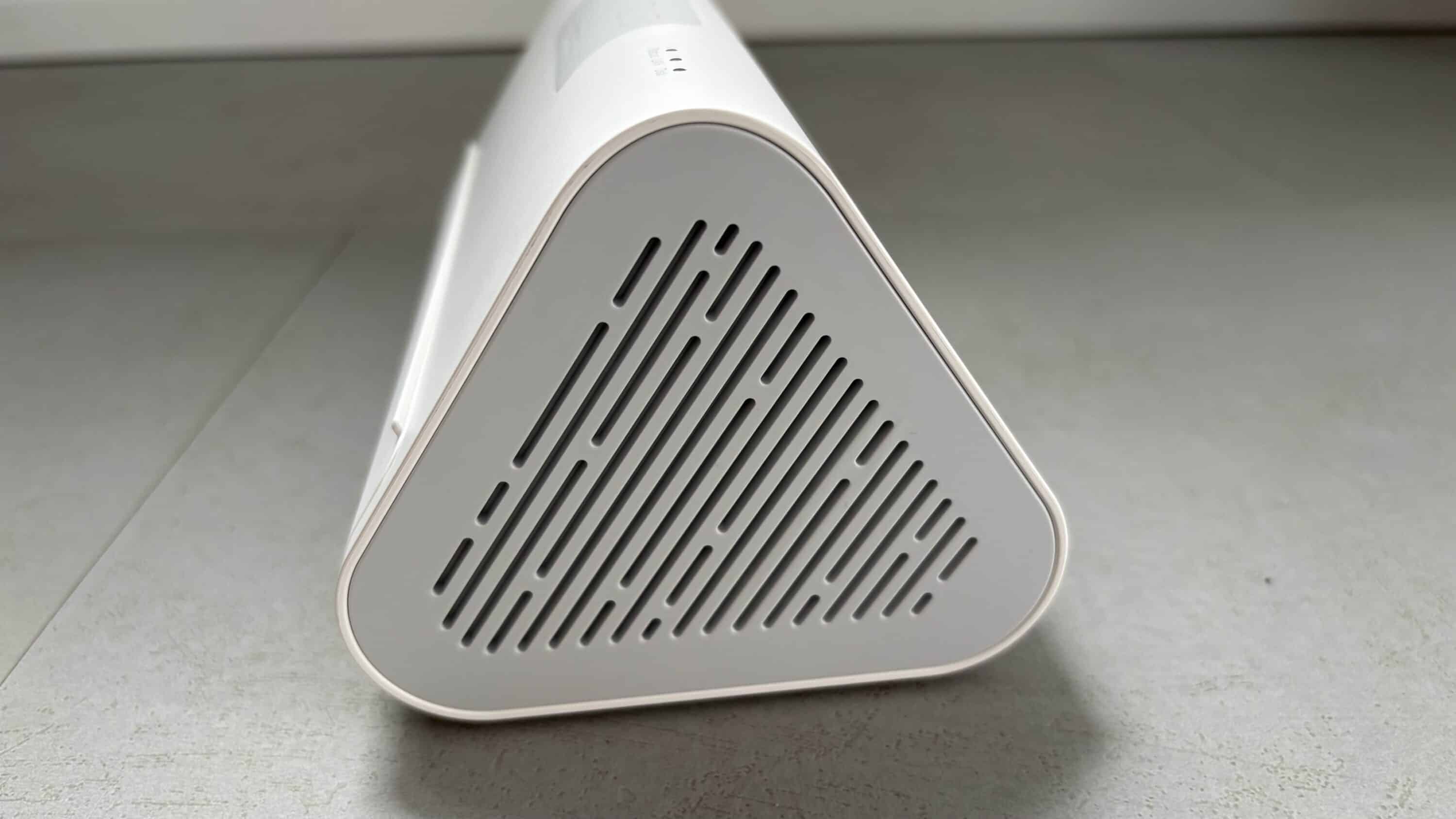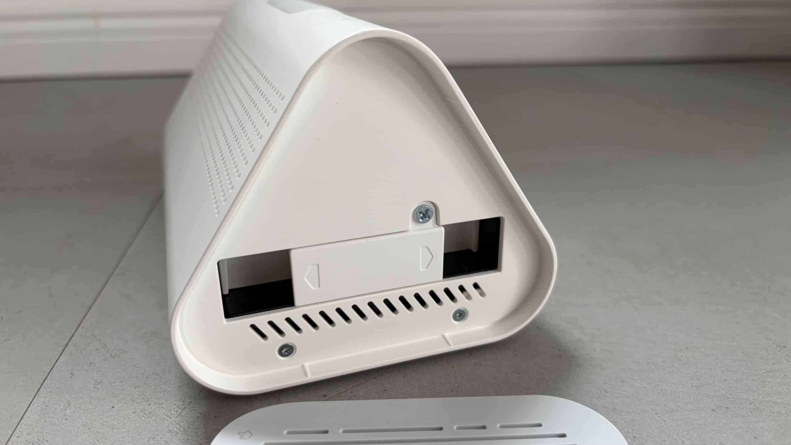An der Front befindet sich eine praktische Klappe, die im heruntergeklappten Zustand als Tablet-Ständer dient. Warum das hilfreich ist, klären wir später. Links und rechts sitzen jeweils Lüftungsschlitze, damit es dem Tapo H500 nicht zu warm wird. Auf der linken Seite befindet sich zuzüglich noch ein Schacht, über den ihr eine Festplatte für zusätzlichen Speicher einsetzen könnt.
