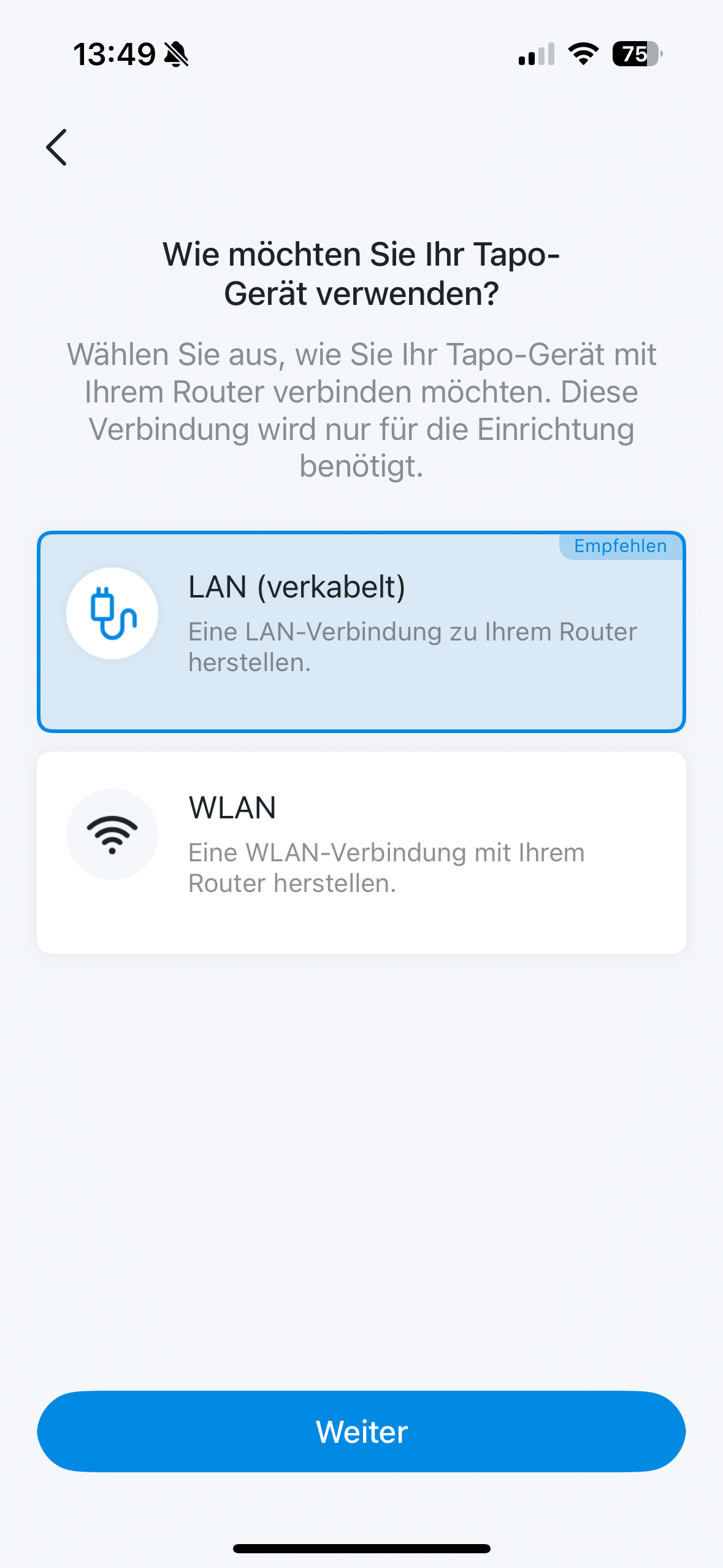 Die Inbetriebnahme des Tapo H500 ist wirklich idiotensicher. Zunächst solltet ihr nach einem geeigneten Arbeitsplatz für das Hub suchen. Hier ist eine Steckdose Vorraussetzung. Habt ihr einen geeigneten Platz gefunden, verbindet ihr den Hub einfach per Stromkabel. Als nächstes entscheidet ihr, ob ihr den Hub per LAN-Kabel oder kabellos über WLAN mit eurem Heimnetzwerk verbinden wollt. Dass WiFi möglich ist, finde ich richtig gut.