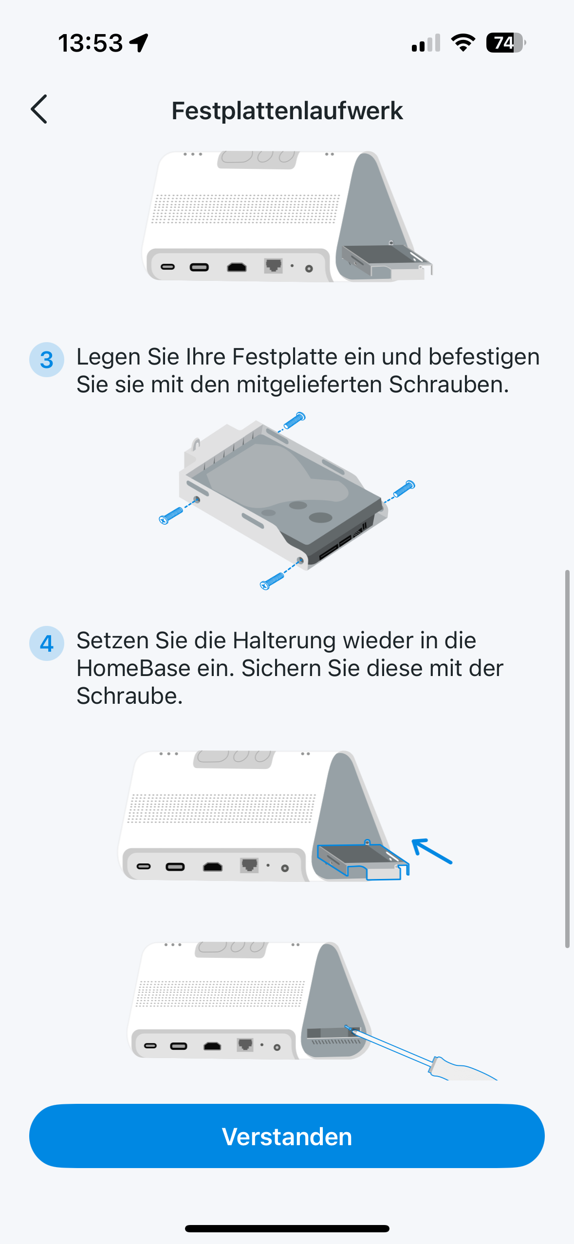 Ihr könnt jedoch über den Schacht an der Seite Festplatten mit bis zu 16 TB Speicherplatz nachrüsten. Da sind viele Stunden an hochauflösendem Videospeicher möglich. Ihr solltet allerdings darauf achten, dass die Festplatte nicht sofort funktioniert, wenn ihr sie in den Hub einsetzt.