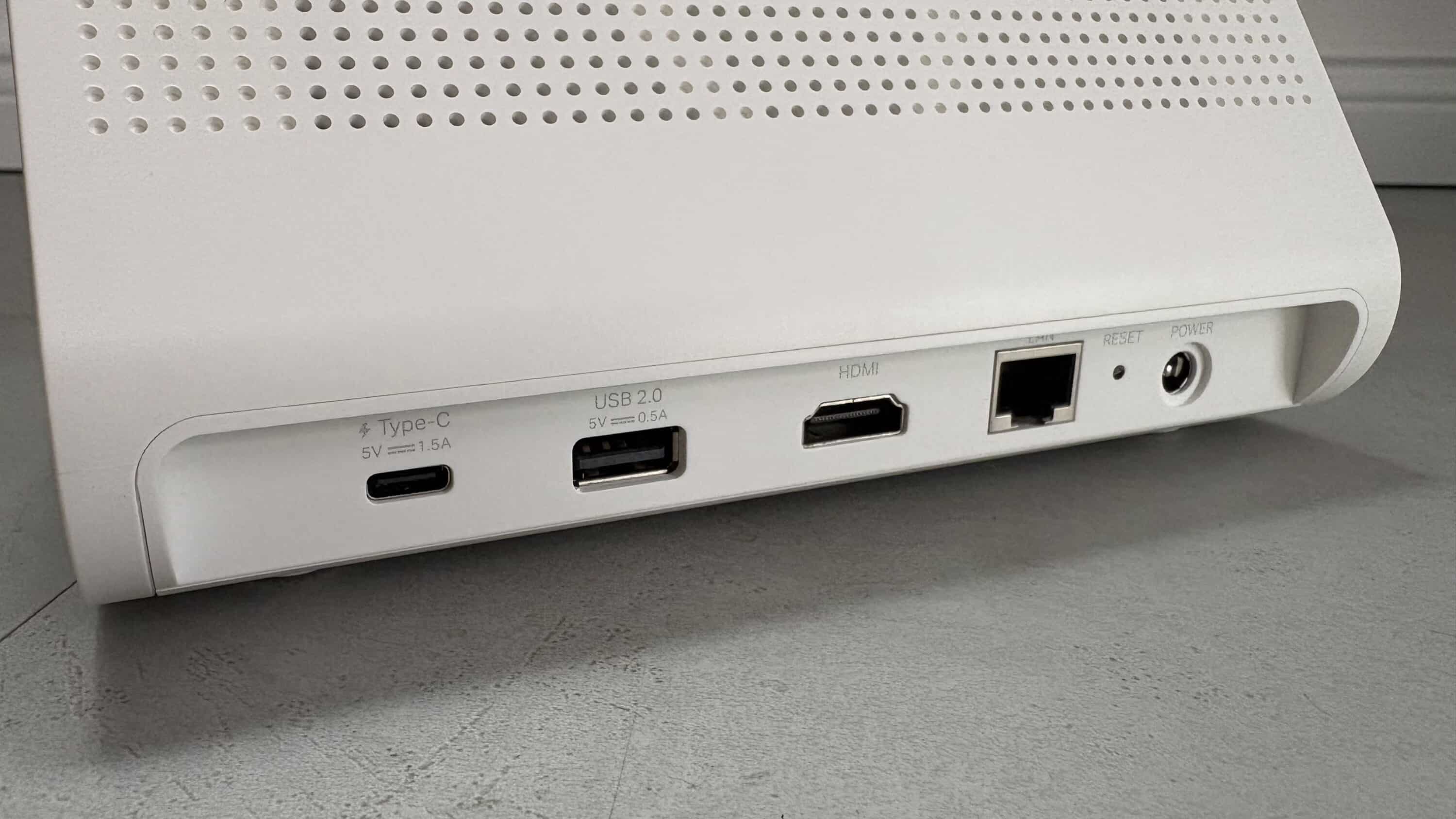 Rückseitig befindet sich nicht nur der bereits erwähnte Lautsprecher. Obendrein befinden sich hier die Anschlüsse des Hubs. Der H500 verfügt über einen USB-C-Port, einen USB-2.0 Typ-A Port, einen HDMI-Port sowie einen LAN-Anschluss. Bei den Anschlüssen finden wir dann auch den Netzanschluss für die Stromversorgung sowie einen Reset-Button. Neben der Bedieneinheit sitzen oben noch Status-LEDs sowie das Mikrofon.