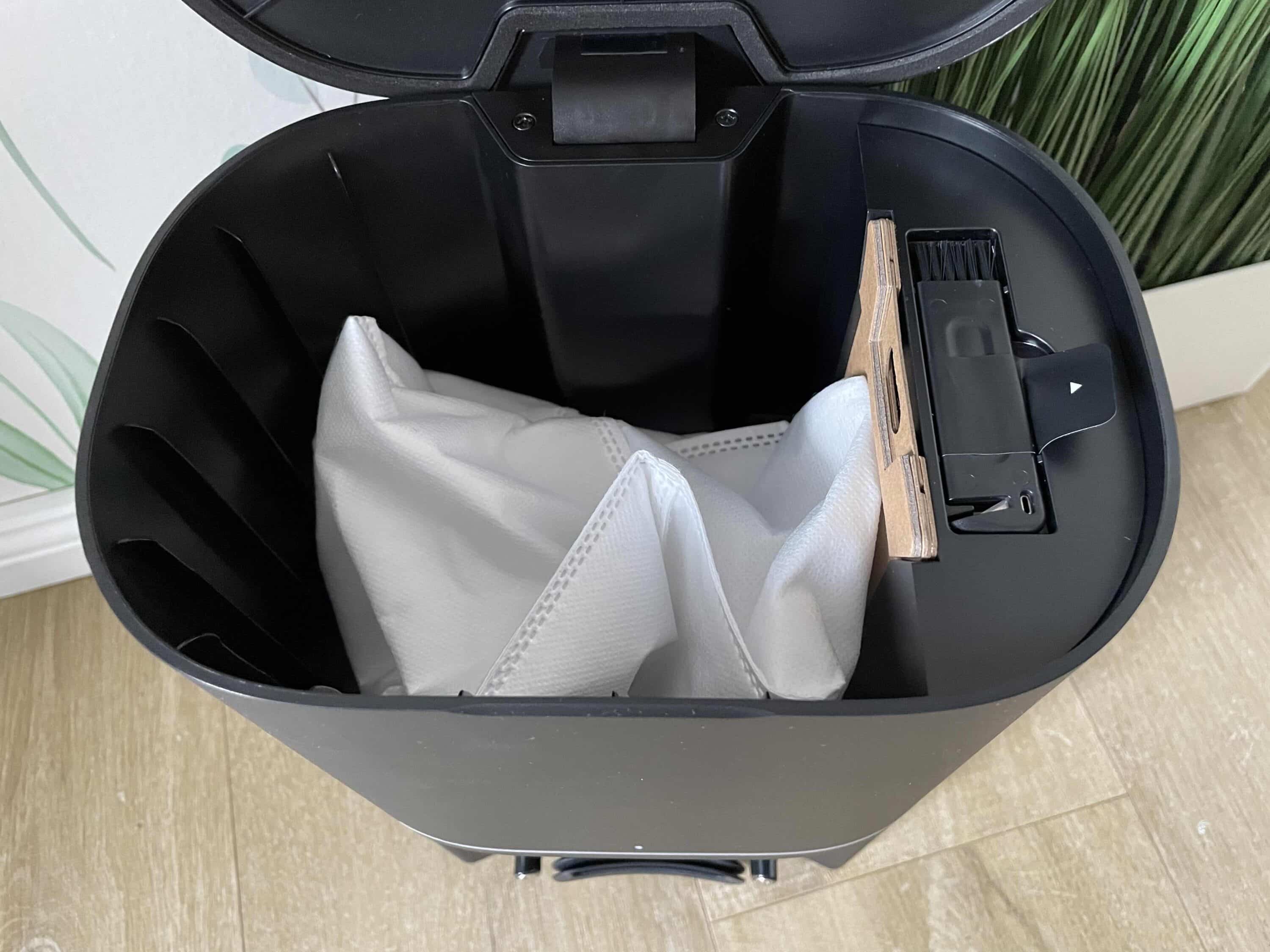 Auch die Absaugstation kommt wie ein andersfarbiges Gleichnis der Variante des RV30 Plus daher. Das mattschwarze Design steht auch ihr sehr gut. Auf der Oberseite erhält man über einen Deckel Zugang zum insgesamt 3 Liter fassenden Staubbeutel im Inneren. Dieser soll soviel Fassungsvermögen vorweisen, dass man nur etwa alle 60 Tage einen neuen einsetzen muss.
