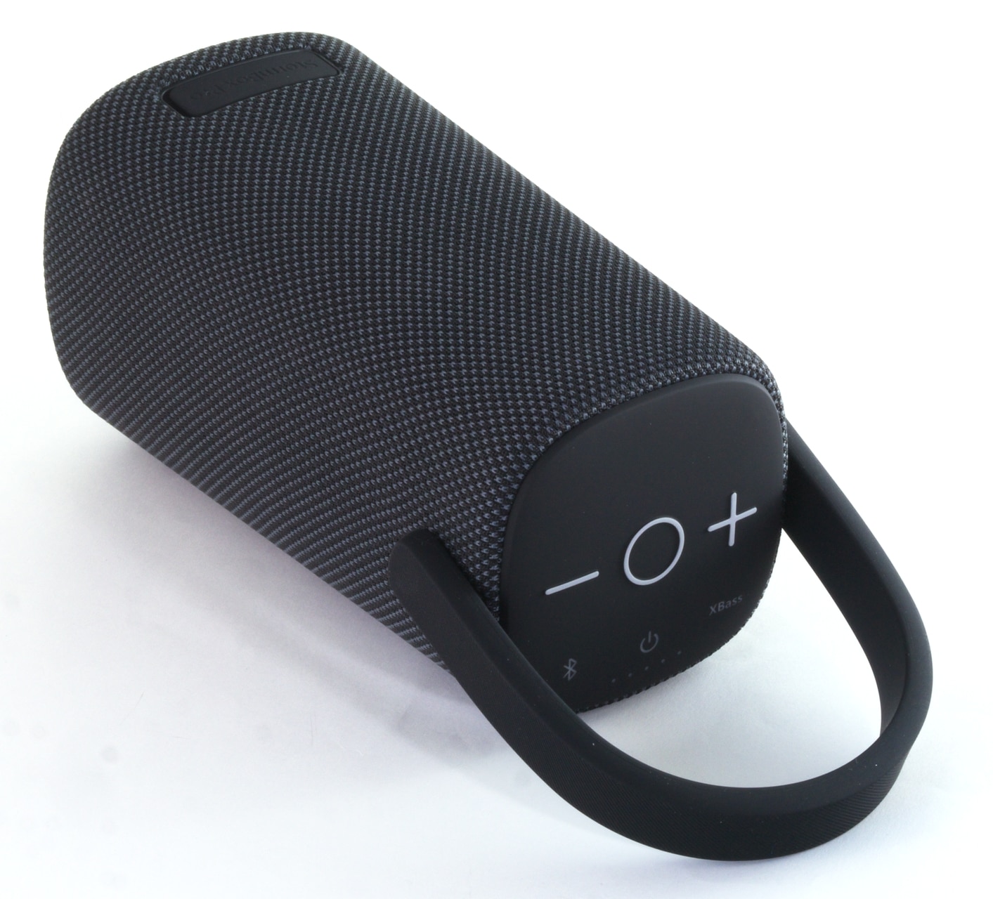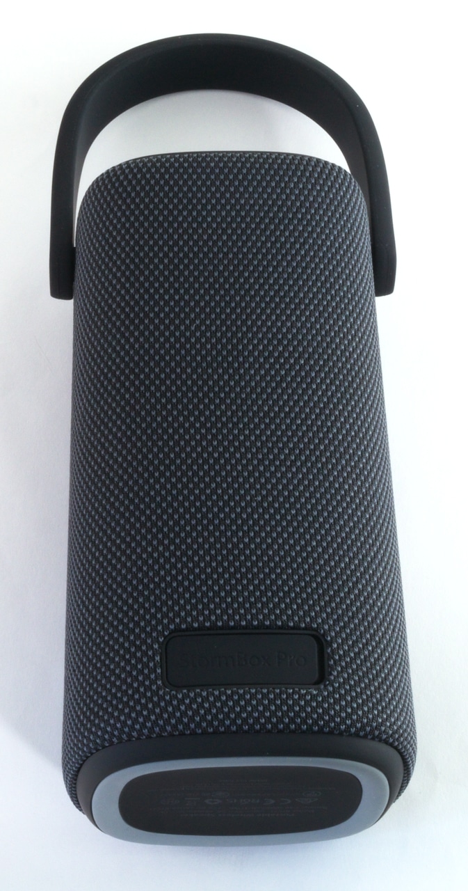 An der Unterseite der Stormbox Pro ist das Kunststoffgehäuse zu sehen, in das ein Gummiring als Standfuß eingelassen ist. Auf der Oberseite befinden sich hingegen die Bedienelemente: Insgesamt verfügt der Lautsprecher über sechs Tasten. Neben einem Power-Button und zwei Lautstärketasten gibt es noch eine Multifunktionstaste und je einen Druckknopf um Bluetooth sowie den Bass-Boost zu aktivieren