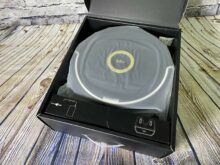 Recht unauffällig von außen, mit einem auffälligen goldenen Kreis auf der Haube, ist die Lucy nun ausgepackt und für eine genauere Betrachtung unserer Seite bereit. Grundlegend finden wir hier das übliche Design eines Staubsaugroboters wieder. Viel Plastik mit einer glänzenden Schicht an der äußeren Haut und von innen mit Technik gefüllt. Wobei Plastik meistens etwas „billig“ wirkt, macht es hier aber einen wertigen Eindruck. Beim Stickwort billig müssen wir aber auf die Klappe aufmerksam machen. Öffnet man diese, um an die wichtigsten Funktionen zu gelangen, hat man das Gefühl, dass die dreieckige Klappe jeden Moment abbrechen könnte. Es wabbelt und fühlt sich durch die zwei kleinen Plastikscharniere sehr instabil an.