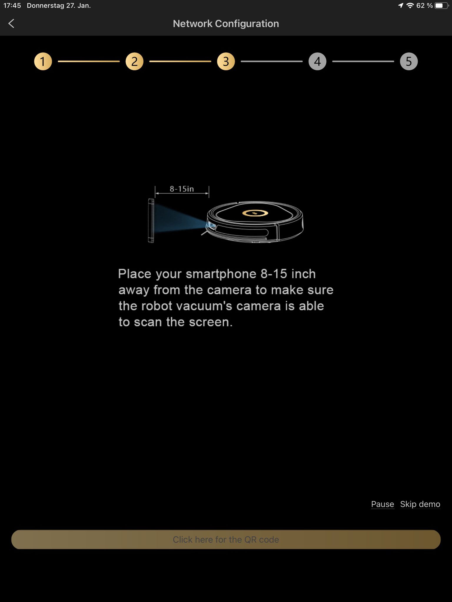 Um nun den Saugroboter einzurichten, geht man auf das auffällige „+“ in der Mitte des Displays. Nach Auswählen seiner Saugroboter-Version muss man fünf kleine Schritte ausführen. Als Erstes muss man die „Recharge“-Taste für fünf Sekunden drücken, damit der Saugroboter in den Kopplungsmodus geht. Danach muss man seine WiFi-Angaben in der App hinterlegen. Im nächsten Schritt bekommt man eine Anweisung für den vierten Schritt – das eigene Handy soll mit 20-40 cm Abstand vor der Kamera des Saugroboters positioniert werden. Auf dem Smartphone wird dann ein QR-Code angezeigt, welcher gescannt wird und die Kopplung startet. Nach einer kleinen Wartezeit ist schon alles erledigt. Insgesamt hat der Vorgang rund 10 bis 15 Minuten gedauert und ging einfach von der Hand.