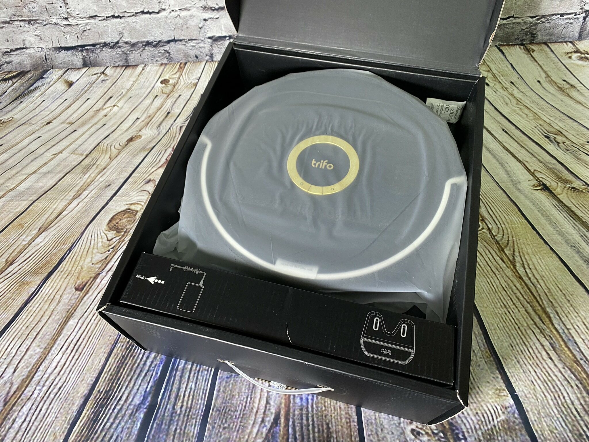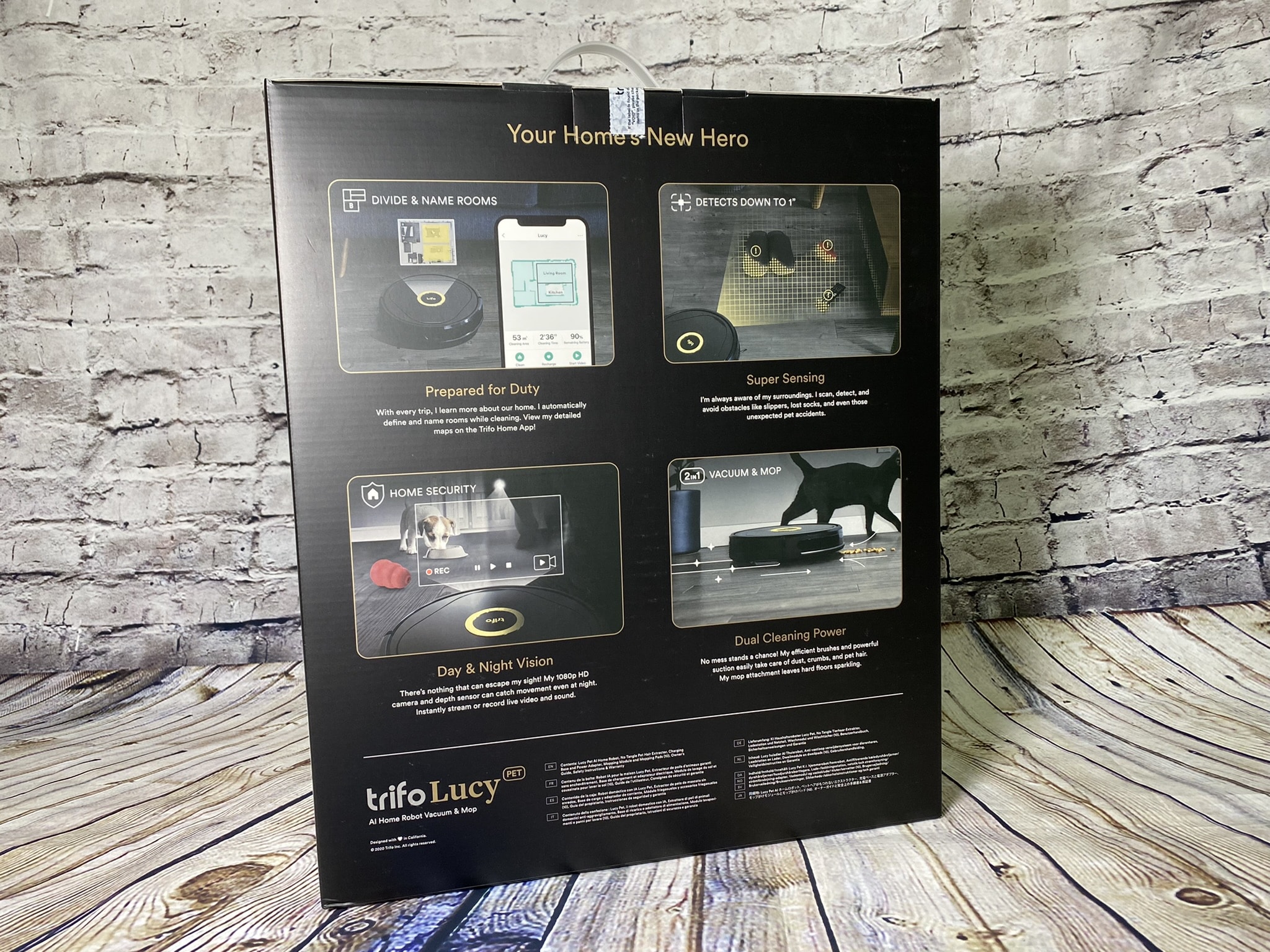 Schwarz ist edel – Die Lucy in der Pet-Variante wird in einer schwarzgoldenen Verpackung mit edlem Blick auf den Roboter versendet. Rund um die Verpackung und besonders auf der Rückseite finden wir die wichtigsten Features des Saugroboters kurz und mit eindeutigem Bild beschrieben. Macht man den Deckel auf, bekommt man einen schwarzen Umschlag zu sehen, in dem die Bedienungsanleitung zu finden ist. Das Auspacken wird hier schon zu einem Erlebnis.