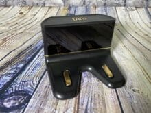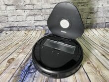 Recht unauffällig von außen, mit einem auffälligen goldenen Kreis auf der Haube, ist die Lucy nun ausgepackt und für eine genauere Betrachtung unserer Seite bereit. Grundlegend finden wir hier das übliche Design eines Staubsaugroboters wieder. Viel Plastik mit einer glänzenden Schicht an der äußeren Haut und von innen mit Technik gefüllt. Wobei Plastik meistens etwas „billig“ wirkt, macht es hier aber einen wertigen Eindruck. Beim Stickwort billig müssen wir aber auf die Klappe aufmerksam machen. Öffnet man diese, um an die wichtigsten Funktionen zu gelangen, hat man das Gefühl, dass die dreieckige Klappe jeden Moment abbrechen könnte. Es wabbelt und fühlt sich durch die zwei kleinen Plastikscharniere sehr instabil an.