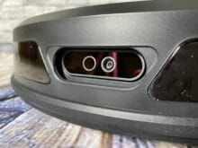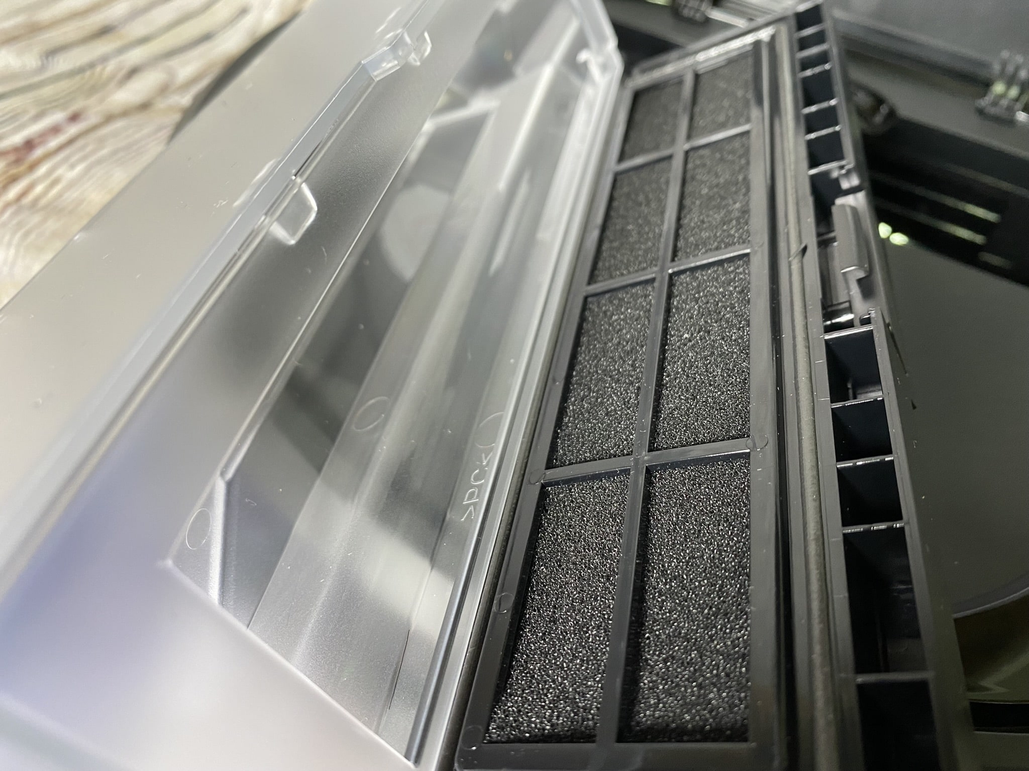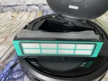 Unter dieser Klappe befinden sich ein durchsichtiger Behälter für den Staub, ein Power-, Home- und Reset-Button, eine Wi-Fi-LED und schließlich ein USB-Charging-Port. Die Knöpfe haben ein eindeutiges Feedback und lassen sich demnach gut bedienen. Wie sinnvoll ein extra USB-Ladeport ist, lässt sich bei der mitgelieferten Ladestation anzweifeln. Jedoch ist dafür der Staubbehälter in der Mitte groß genug, um einiges an Fahrten mitmachen zu können. Baut man diesen aus, indem man auf den „Push-Button“ drückt, kann man dazu noch einen Blick auf die Unterseite werfen. Die verbauten Filter befinden sich hier in einem hervorragend gefertigten Zustand und erfüllen unsere Erwartungen gänzlich. Außen herum befinden sich an der vorderen Kappe dann ein Stoßdämpfer mit einer verbauten Kamera sowie einige Sensoren.