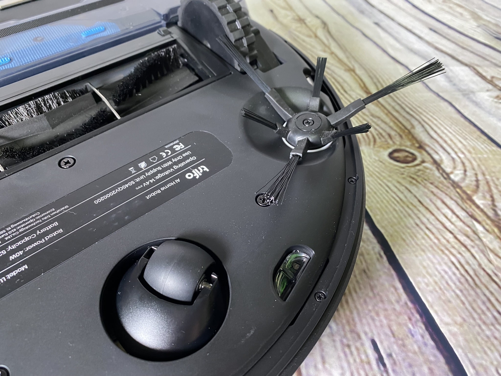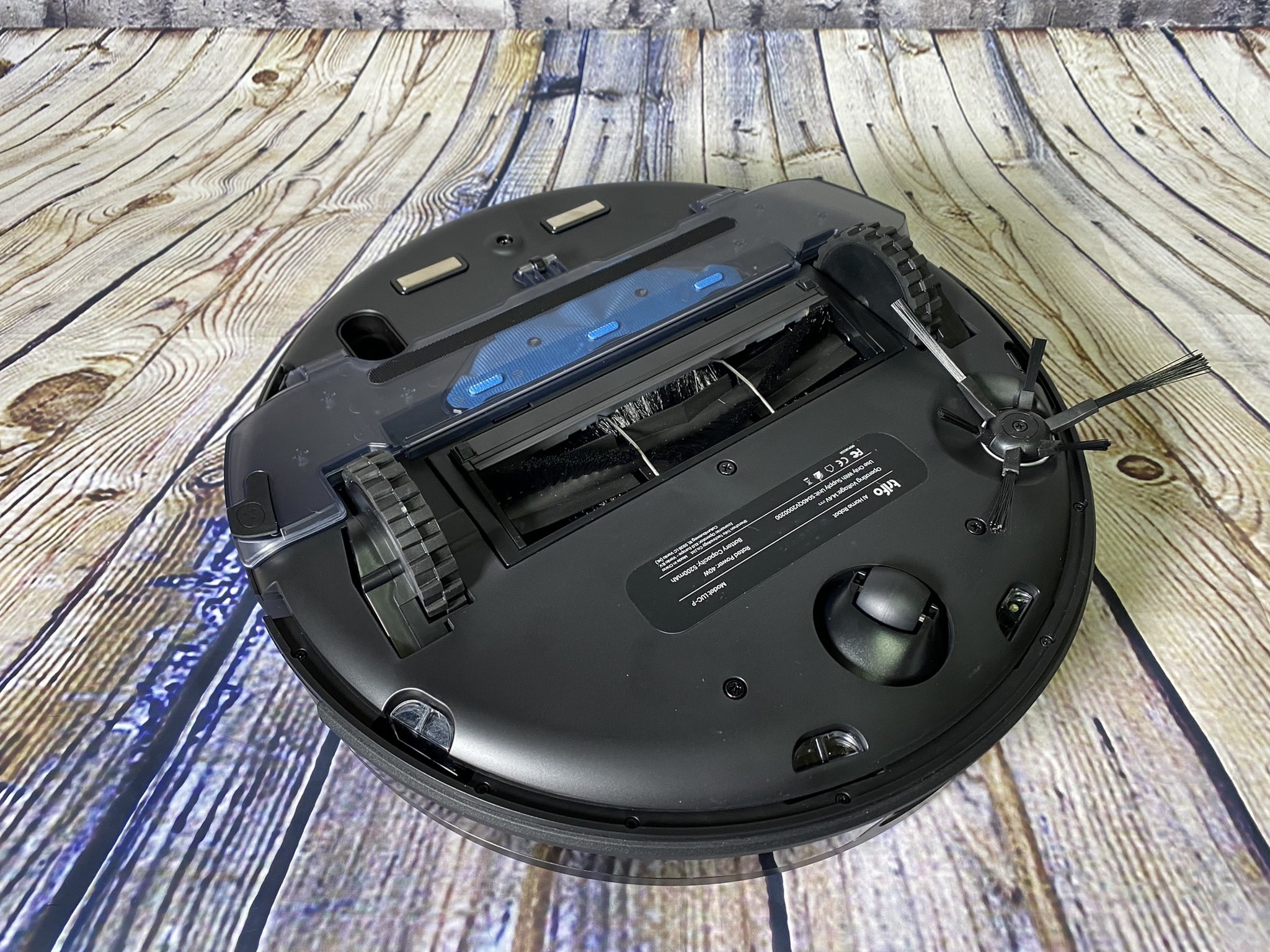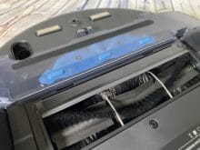 Drehen wir die Lucy auf den Kopf, können wir nun noch mehr begutachten – Zunächst fangen wir auf der hinteren Seite an. Dort befinden sich zwei längliche Kontakte für das Laden an der Ladestation. Etwas weiter darunter befindet sich ein Behälter mit Klettverschlüssen für die die Montage der Wischlappen. In der Mitte befindet sich das Herzstück des Saugroboters: der Saugkopf, für denen wir zwei Varianten haben. Standardmäßig verbaut ist eine Bürste, welche in Schlangenlinien bestückte Bürsten hat. Damit sollte in der Praxis jeder Schmutz von Beispielweise einem Teppich aufgesaugt werden. Links sowie rechts daneben befinden sich die großen Rollen für die Fortbewegung des Roboters. Am vordersten Rand ist schließlich noch eine Rolle, die sich in alle Richtungen drehen kann. Etwas seitlich befindet sich dann noch eine drehende Bürste, für diese wird leider kein Ersatz mitgeliefert.