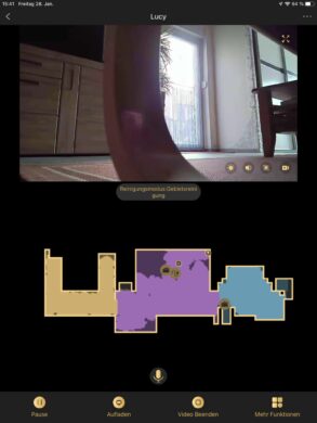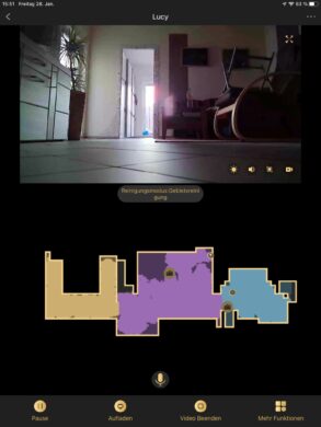 Genug begutachtet und gequatscht – es ist nun mehr als Zeit, die Hausarbeit zu erleichtern. Nach dem ersten „mapping“ und schließlich einem ersten Lauf merkt man der Lucy noch ein paar Anfangsschwierigkeiten an. In unserem Fall hat sich der Saugroboter an einer Ecke des flachen Teppichs im Wohnzimmer festgelaufen. Nach einem kleinen Stoß lief sie jedoch problemlos weiter. Später in den weiteren Runden ist so ein Problem nicht mehr vorgekommen – der Saugroboter lernt demnach mit! Schuld ist wahrscheinlich das fehlende Laser-Raumvermessungssystem. Hier wurde mit 3D-Raumerkennung und einer verbauten Full-HD-Kamera mit Tiefen-, Kollisions- und Absturzsensoren etwas neues versucht, was noch Verbesserungspotenzial hat.
