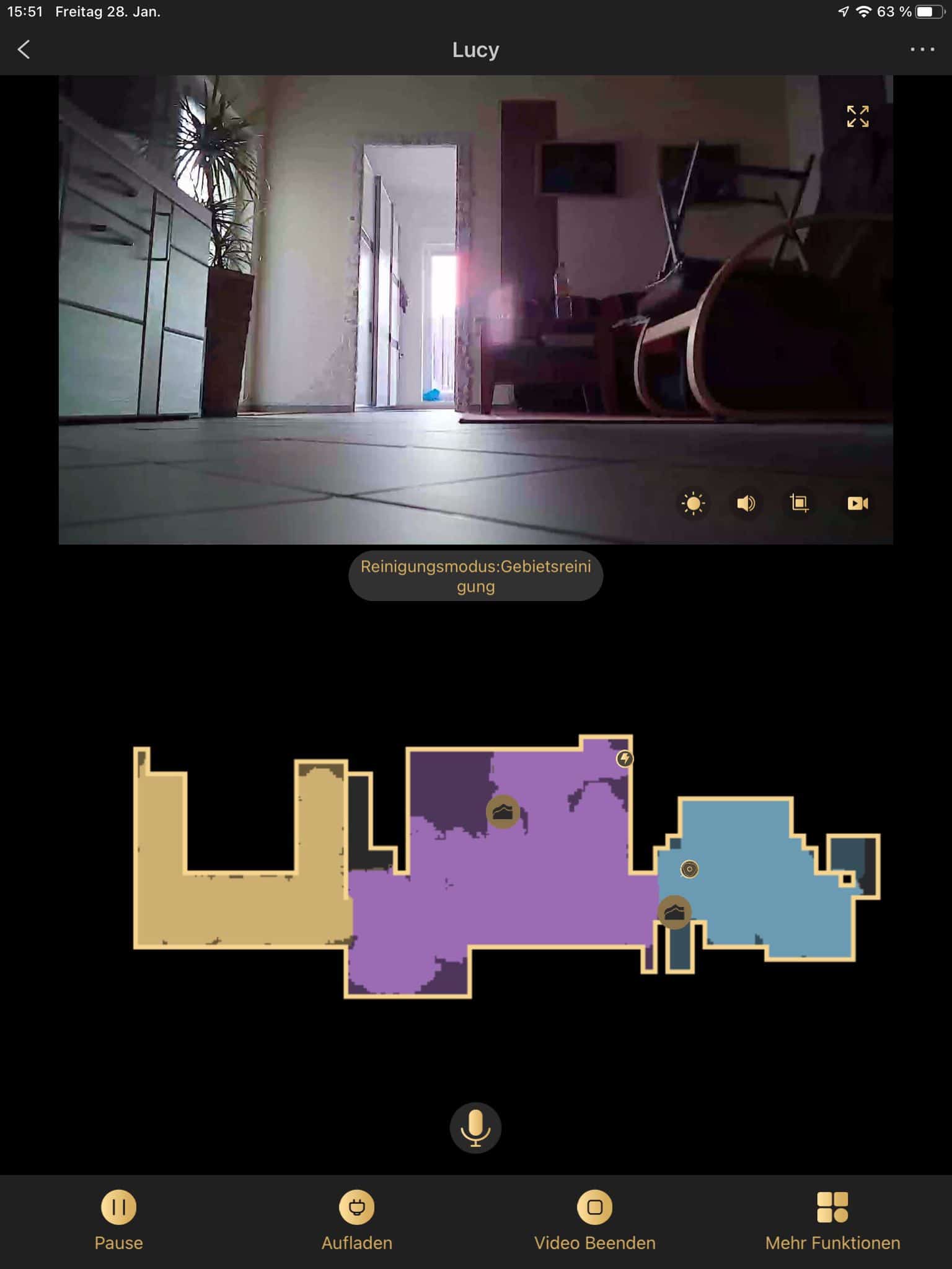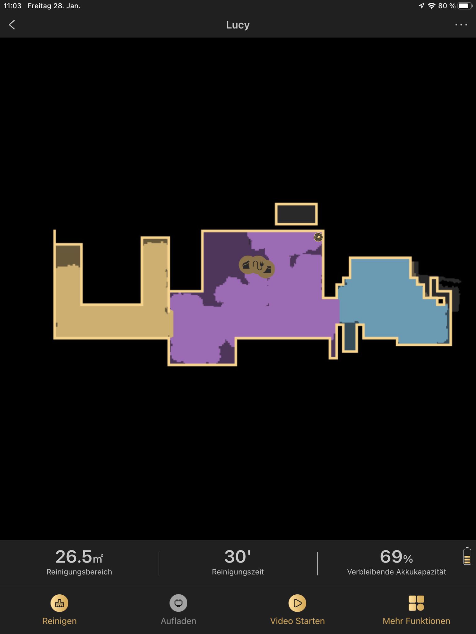 Nach ein paar Minuten weiterer Konfiguration, steht dem Start nichts mehr im Weg. Bei dem wird eine Karte aufgezeichnet und eine Route im Hintergrund berechnet. Diese kann man schließlich auch schön in der App abgebildet sehen – sogar andere Räume werden farblich gekennzeichnet getrennt.