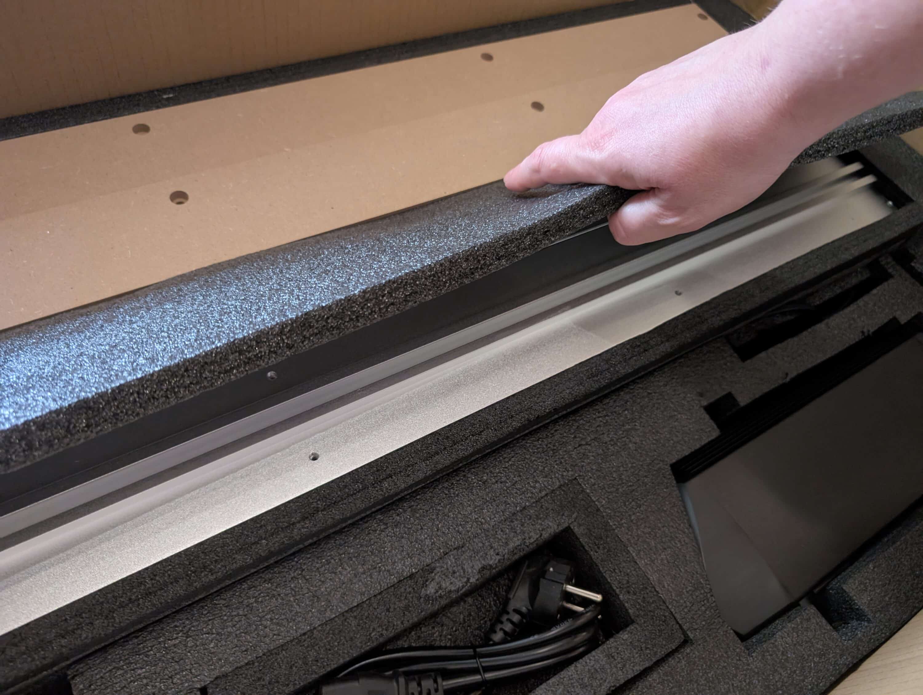 Die TTC-6050 kommt komplett in einem einzigen, aber sehr schweren Karton von etwa 40 Kilogramm. Schon beim Heben zeigt sich, dass hier eine ernst zu nehmende Maschine wartet. Der erste Blick in den Karton offenbart eine beeindruckende Menge an Komponenten, die dennoch ordentlich verpackt sind.