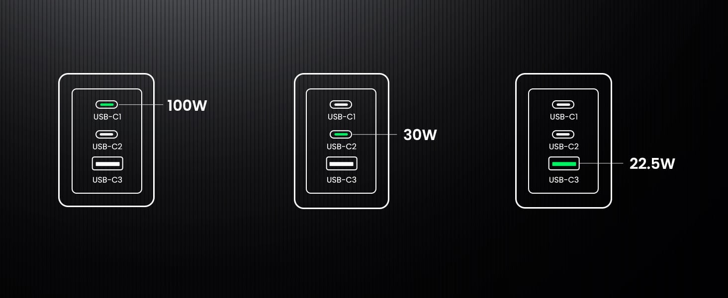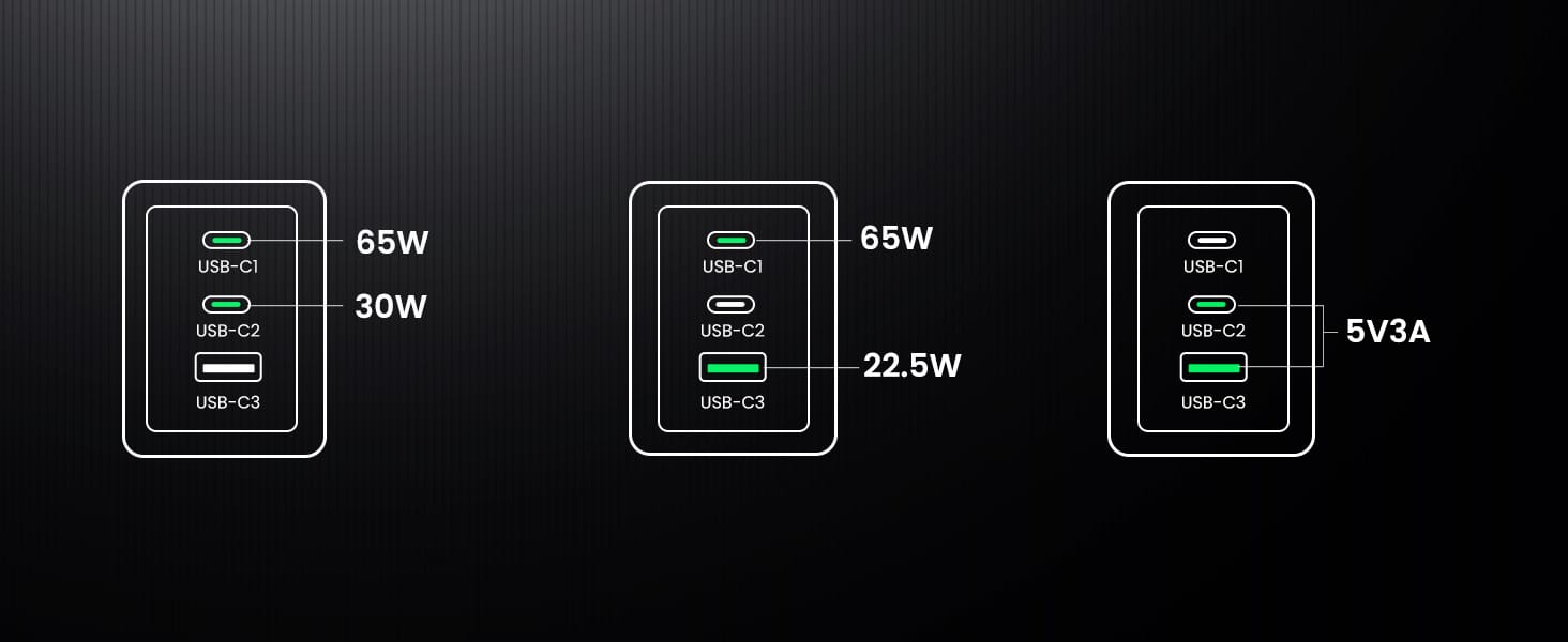 | USB-C1 + USB-C2 + USB-A | 95 W (65 W + 15 W + 15 W) |