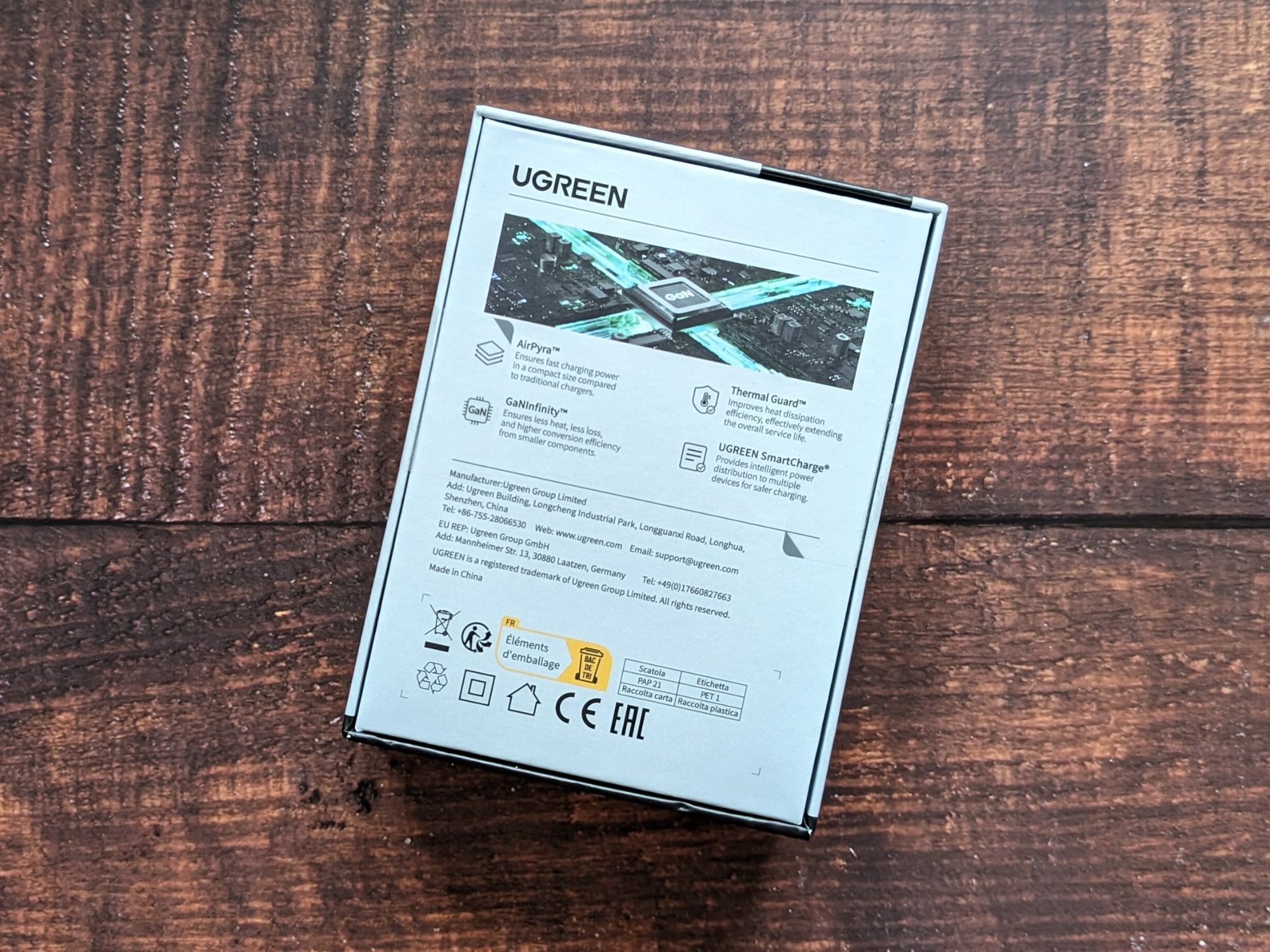 Das UGREEN Nexode Pro 100W wird in einem kompakten hellgrauen Karton mit schwarzen Akzenten geliefert. Auf der Vorderseite sind neben einem Bild des Ladegeräts einige Features aufgelistet, die auf der Rückseite noch einmal näher erläutert werden. Auf einer Seite listet UGREEN auch die Ausgangsleistung der einzelnen USB-Anschlüsse auf.