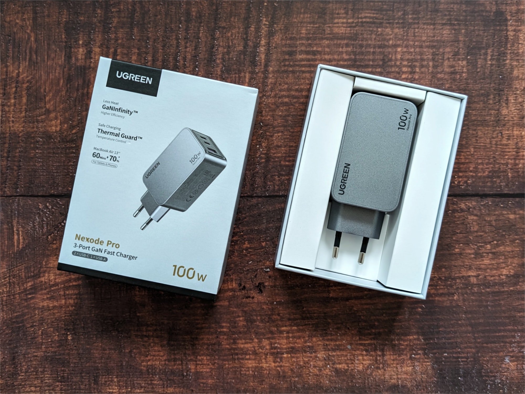 Das Nexode Pro 100W setzt auf auf die GaN-Technologie (UGREEN GaNInfinity). Durch die Verwendung von Galliumnitrid (GaN) statt Silizium sind kompaktere Gehäuse möglich und die angeschlossenen Geräte werden schneller, effizienter und mit geringerer Wärmeentwicklung geladen. Dadurch ist das Nexode Pro 100W deutlich kompakter als das im Lieferumfang des Notebooks enthaltene Netzteil, das ebenfalls eine maximale Ausgangsleistung von 100 W bietet.