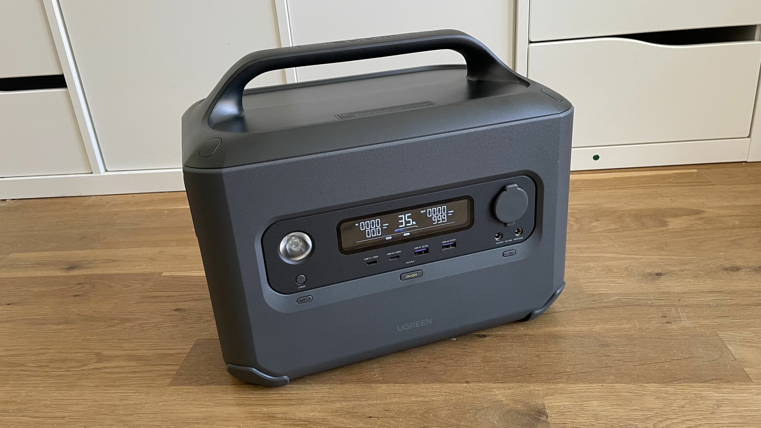 Die PowerRoam 1200 wiegt stolze 12 kg. Damit ist sie schwerer als beispielsweise die AlphaESS BlackBee 1000 (Test), die nur knapp 10 kg auf die Waage bringt. Das hängt aber vornehmlich damit zusammen, dass AlphaESS auf Lithium-Ionen-Akkus setzt, während in der UGREEN LiFePO4-Technik zum Einsatz kommt. Ein wirklicher Freund von dieser statischen Lösung bin ich nicht. Schließlich verhindert dies, dass du etwas auf die Powerstation legen kannst bzw. sie im Kofferraum platzsparend verstauen kannst. Wie es besser geht, stellt beispielsweise die Jackery Explorer 1000 Pro (Test) unter Beweis. Hier lässt sich der Tragegriff bequem einklappen.