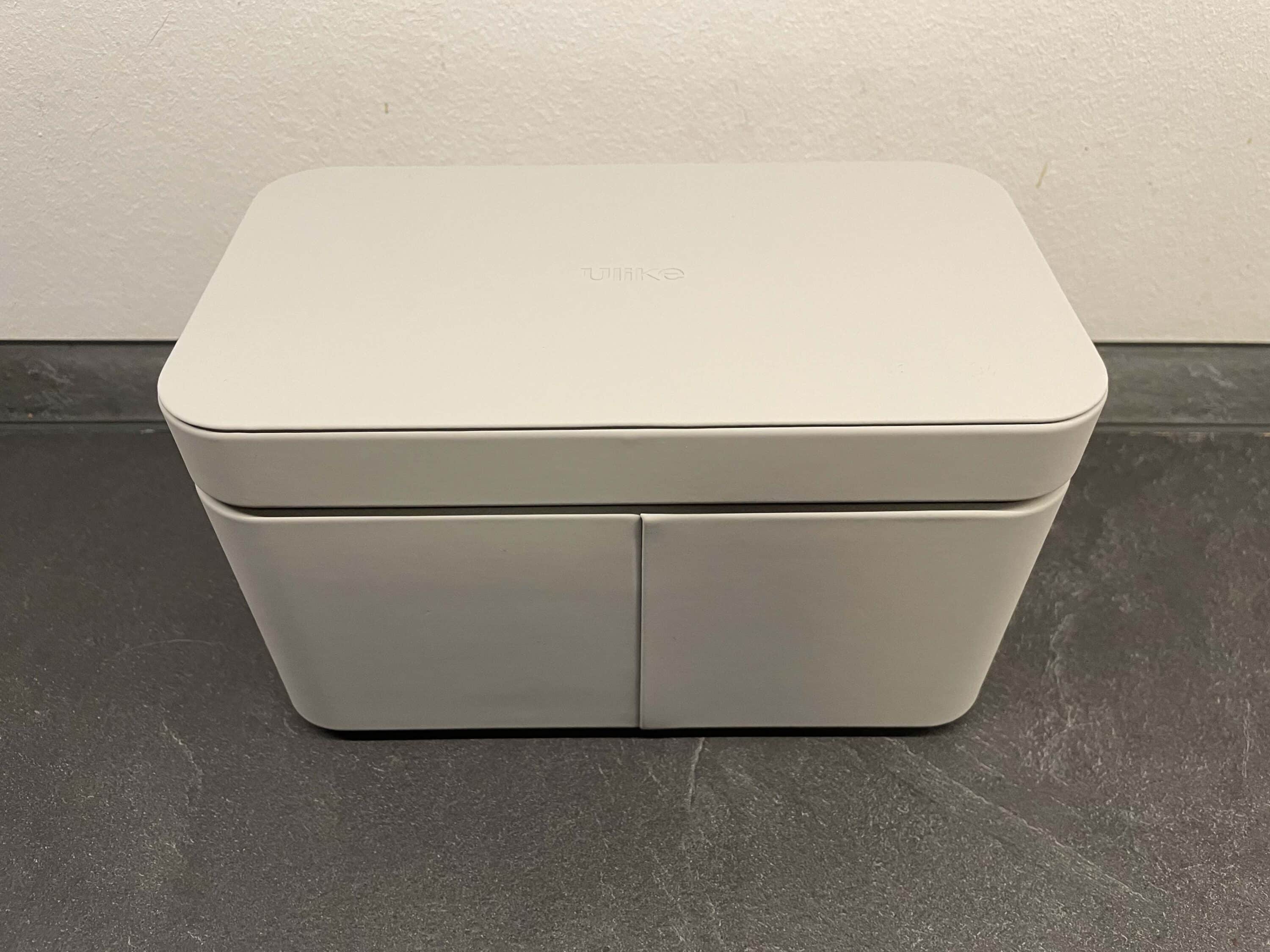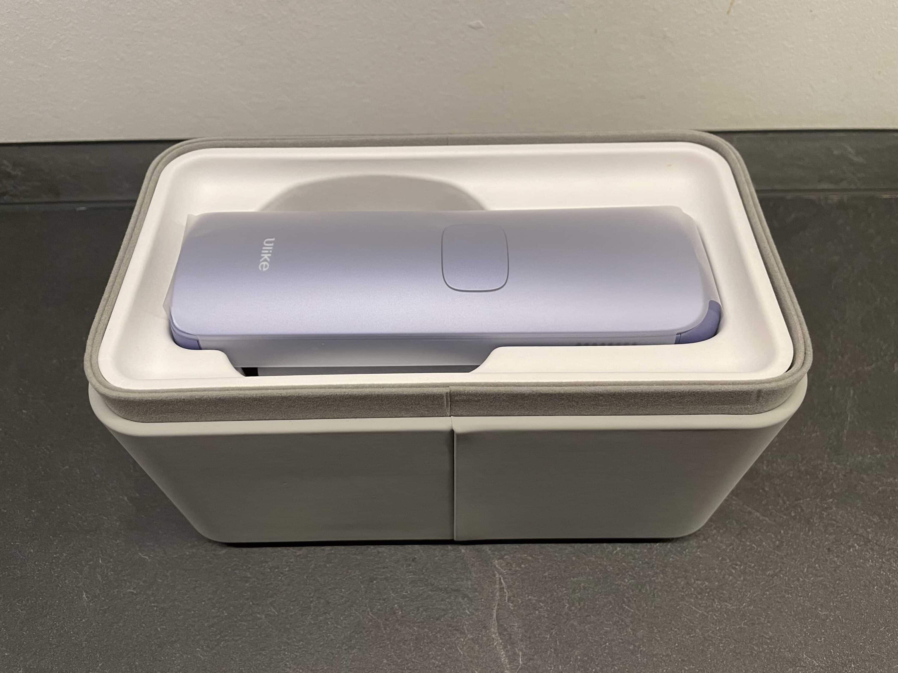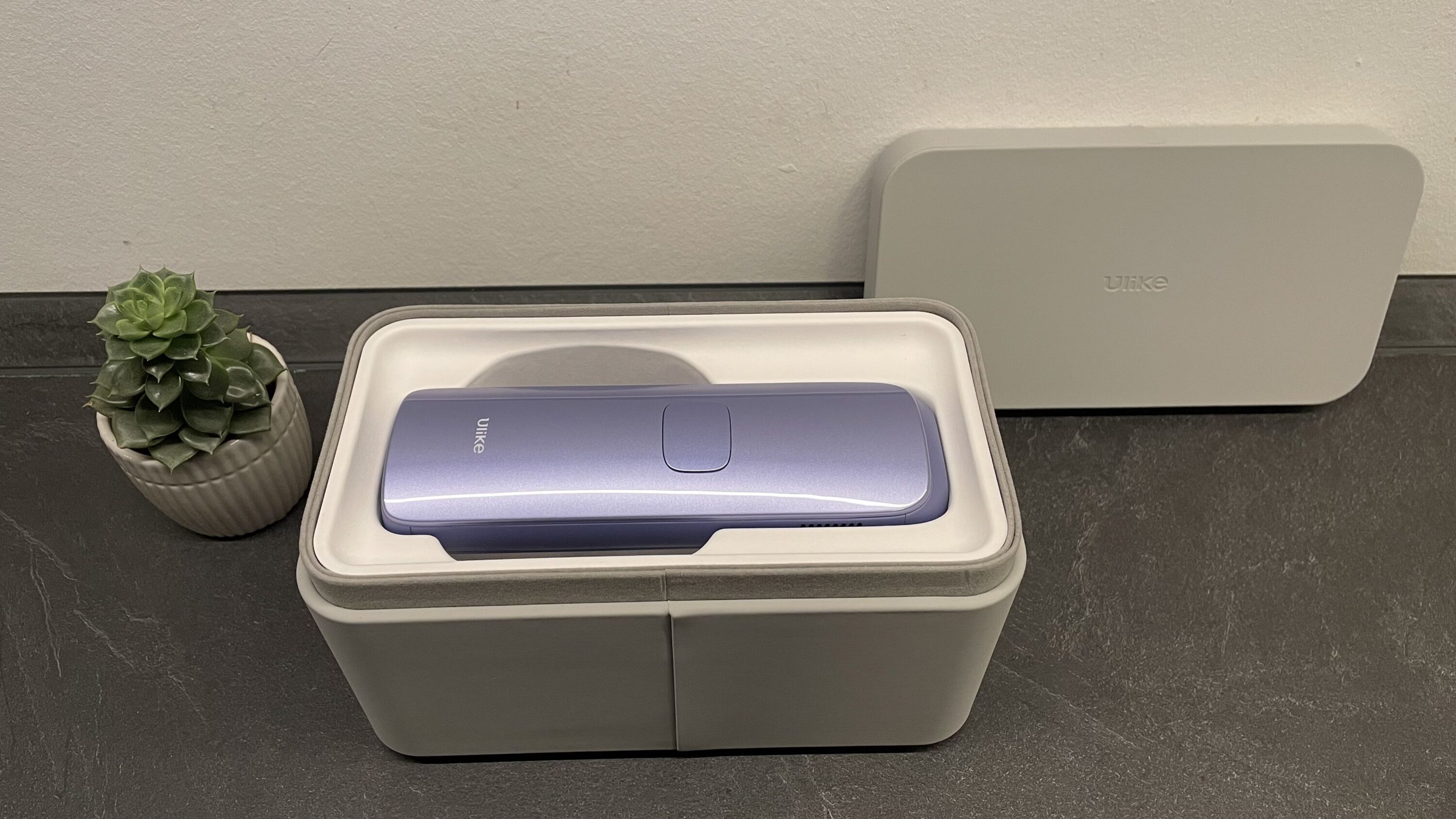 Seitlich befindet sich ein weiterer Knopf, über den ihr das Gerät einschaltet und die Intensität der Impulse reguliert. An der Spitze sitzt die Lichteinheit, an der Unterseite der Eingang für das Stromkabel. Das Gerät selbst und das Zubehör punkten mit einer hochwertigen Materialwahl und tollen Verarbeitung. Richtig praktisch: Zum Ulike Air 3 gibt es eine passende Box. Damit lässt sich das IPL-Gerät auch bequem mit in den Urlaub nehmen oder repräsentativ in Badezimmer oder Schlafzimmer platzieren.