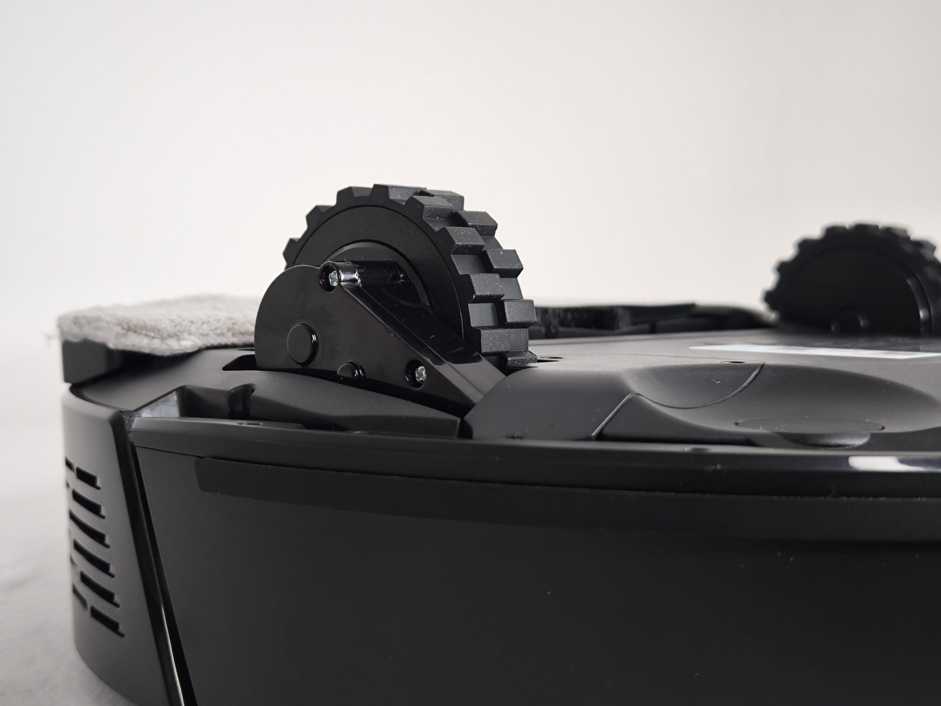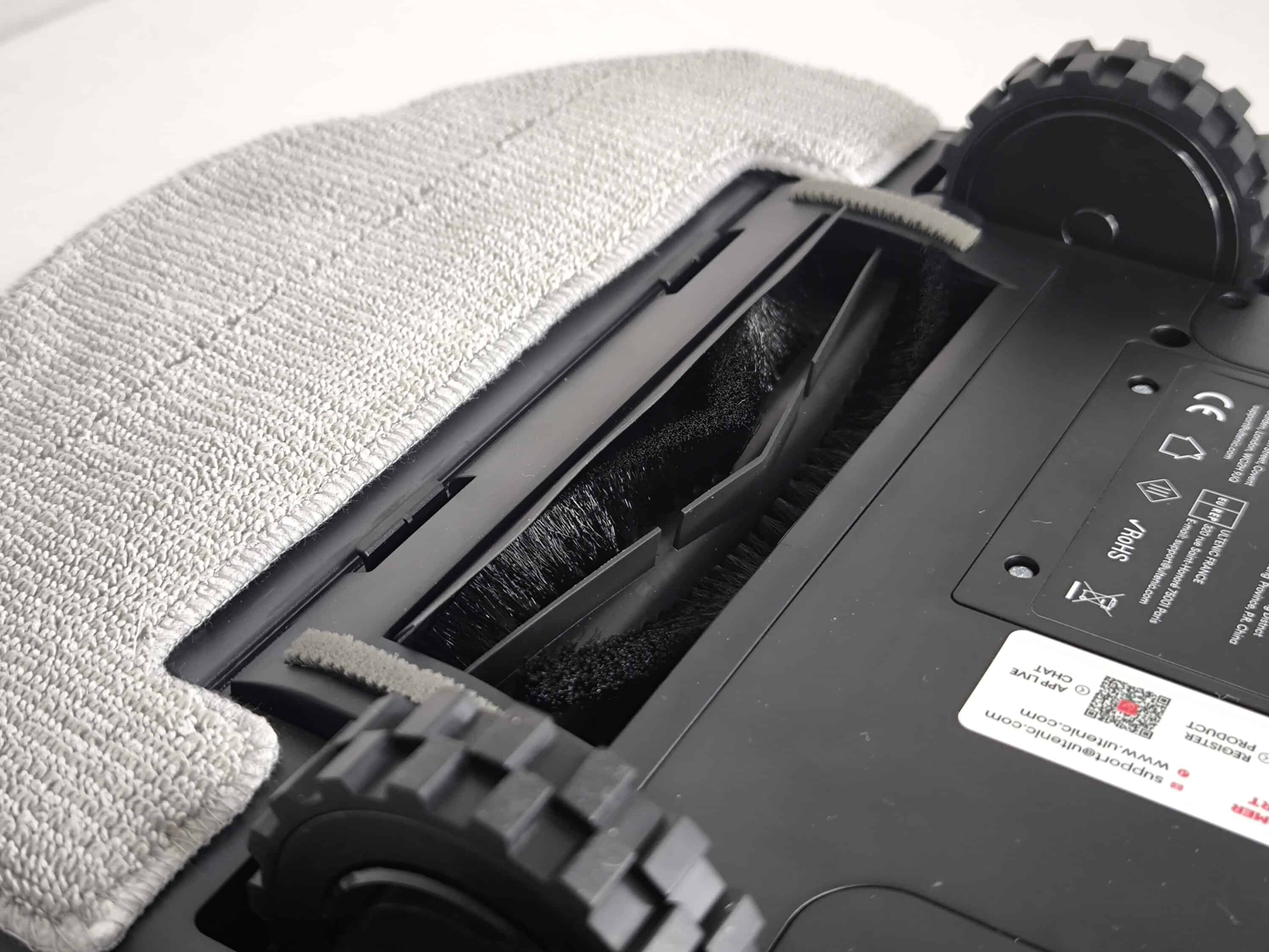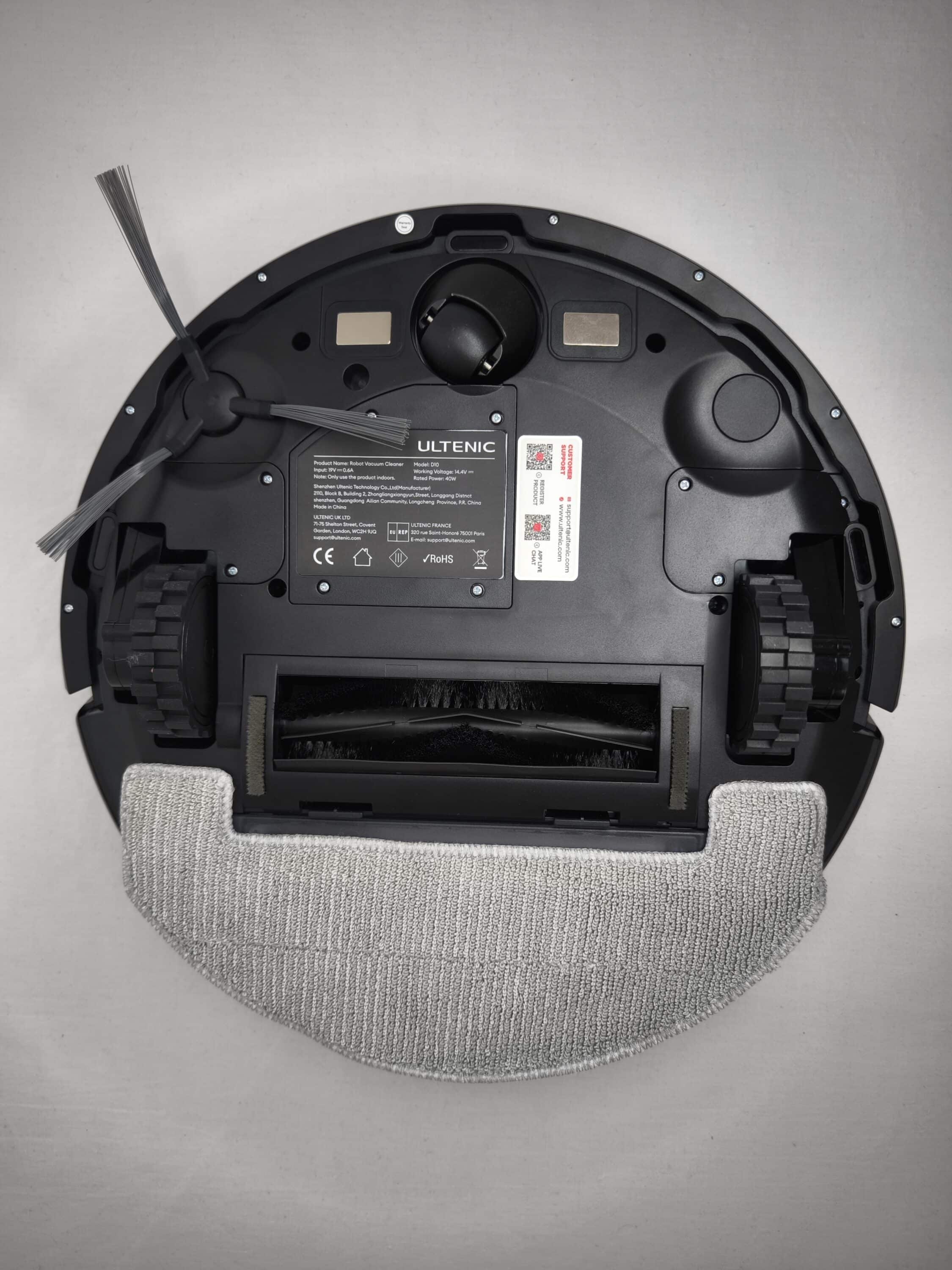 Optisch ist der Ultenic D10 nicht besonders auffällig. Auf der Oberseite befindet sich in der Mitte der LiDAR-Turm zum Scannen der Umgebung, daneben zwei Funktionstasten und eine kleine LED. Auf der Unterseite wird die verbaute Technik sichtbar, die von den Rädern zur Fortbewegung über die Pins zum Aufladen bis hin zu den Reinigungsbürsten bzw. dem Wischtuch reicht.