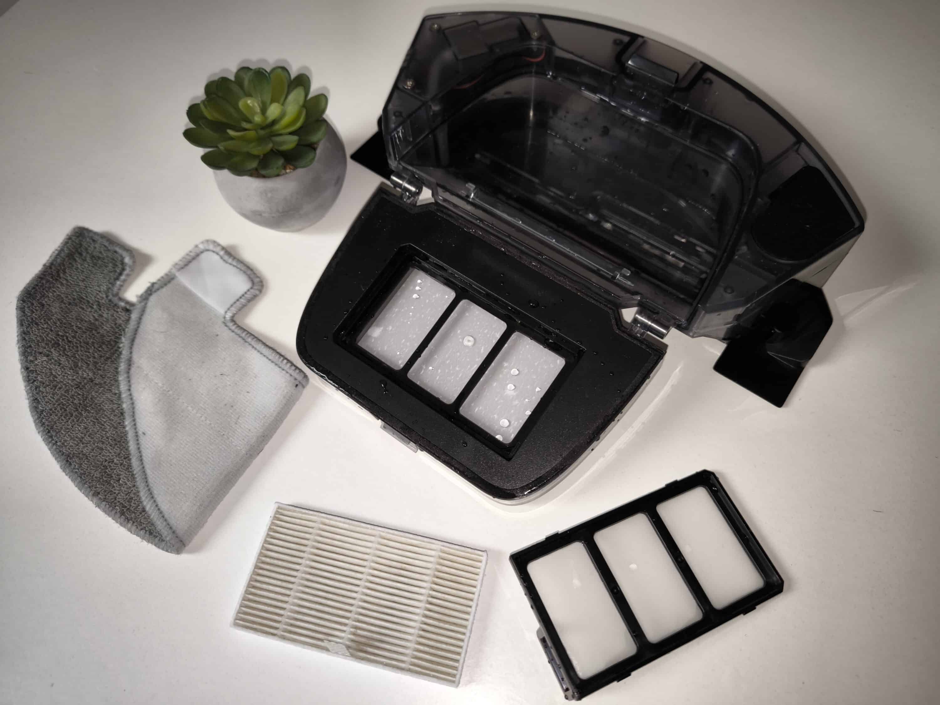 Nach getaner Arbeit muss der Ultenic D10 rechtzeitig gereinigt werden, damit für den nächsten Reinigungsvorgang wieder Platz für neuen Staub ist. Dazu wird der Staubbehälter mit Wassertank durch kurzes Drücken des Knopfes auf der Rückseite entriegelt und nach hinten herausgezogen. Der angesammelte Staub lässt sich nun manuell im Müll entsorgen. Anschließend sollten der HEPA- und der Primärfilter entfernt und mit der mitgelieferten Reinigungsbürste gereinigt werden. Da der Staubbehälter wasserdicht ist, empfiehlt es sich zudem, ihn einmal komplett durchzuspülen und dann einfach trocknen zu lassen.