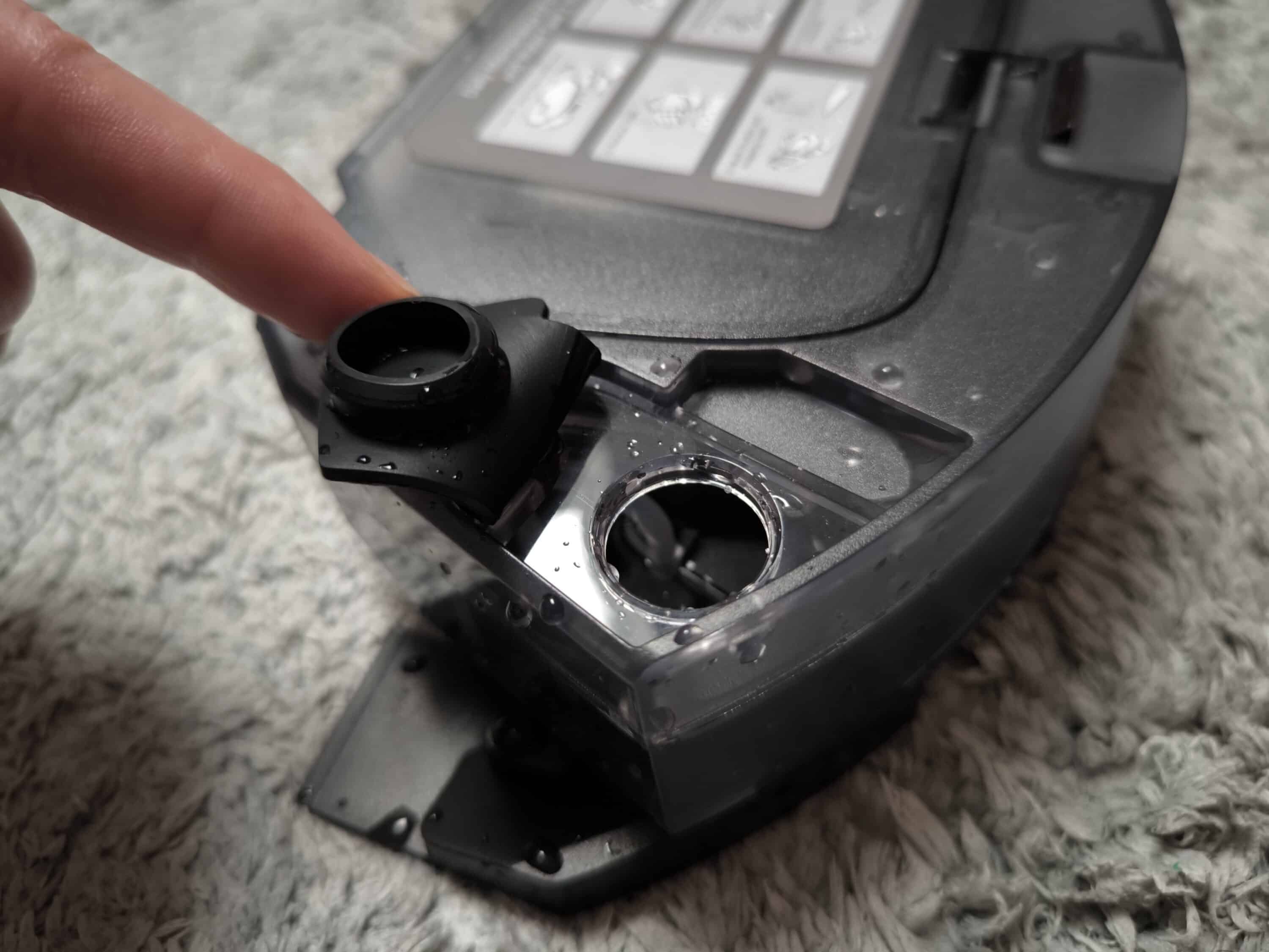 An der Rückseite ist der Staubbehälter mit Wassertank angebracht, der über einen Clipmechanismus abgenommen werden kann. Insgesamt fasst dieser Tank ca. 250 ml Wasser, der Staubbehälter wiederum 350 ml. Da der Ultenic D10 über keine Absaugstation verfügt, muss dieser eigenständig bzw. regelmäßig entleert werden.